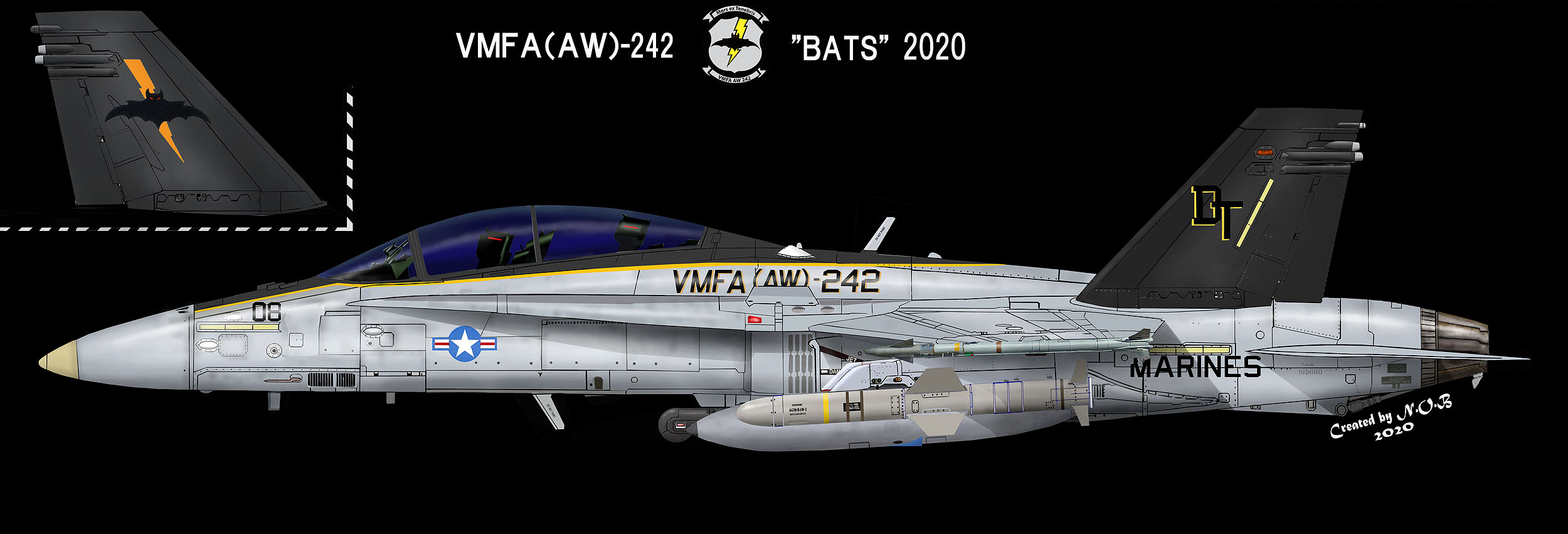 本ページはVMFA(AW)-242の2017年頃の活動から部隊が終焉する2021年までの活動状況を写真と共にご紹介する。同隊は本来の終焉ではなく、ご存知の通り、F-35Bの部隊に転換し”AW"が無くなってVMFAに変わるのである。2008年3月アメリカ西海岸ミラマー海軍基地からVMFA-212の後継長期派遣部隊として岩国海兵隊基地に派遣され、永らく岩国基地に駐留し、最もなじみの深い部隊ともなっていた為、DTテールコードを付けたFA-18Dに別れを惜しむ声は多かった。