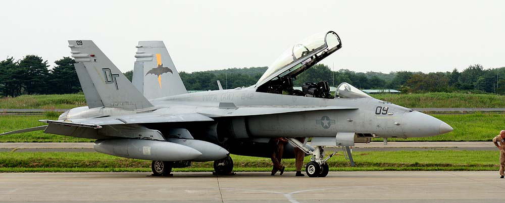 2008年9月6日 八戸基地に翼を休めるFA-18D、翌日三沢に移動する予定が タイヤの亀裂か何かのトラブルで 翌日までお休みとなった。パイロット達だけは 三沢に車で移動し しっかりと出店で商売に余念がなかった。