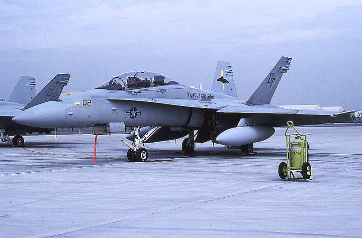 最初にFA-18Dとして 岩国配備になったときは、00番のみ電光を黄色で塗っており 他の機体はグレーのロービジであった。最近は、01番機の派手なマーキングなど マニア好みの塗装を身にまとい話題になることが多い。 ラテン語”MORS EX TENEBRIS”は、暗黒からの死を意味する。