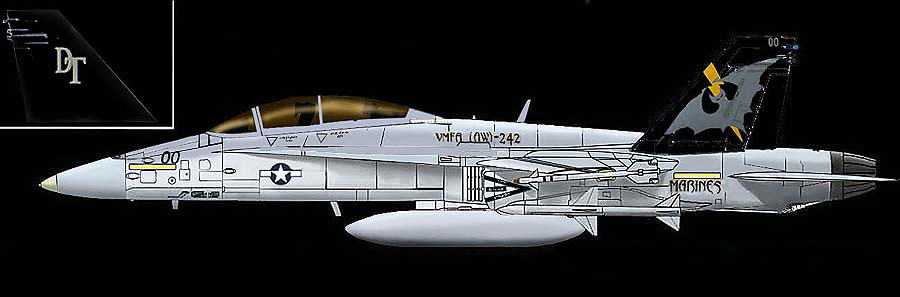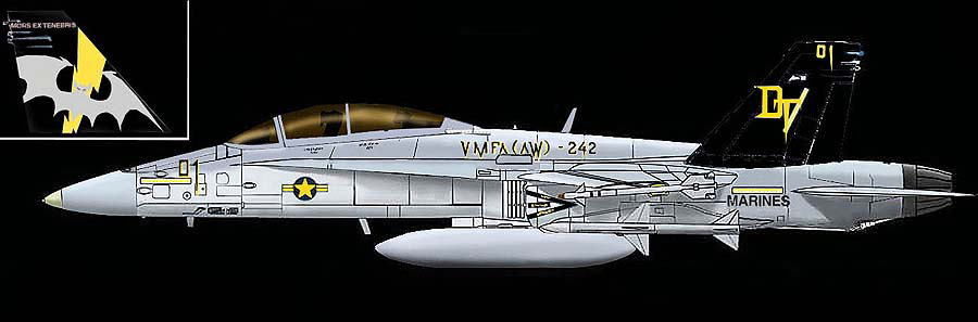 2008年4月から確認された2世代目のブラックテール機。コウモリの絵柄は、ゴースト調、背中のVMFA(AW)-242の文字は、黒一色ではっきり書かれたが MARINEの文字は、グレーに戻った。この後 岩国配備のときにコウモリの絵柄が スプレー書きのぼやけたものに変更される。