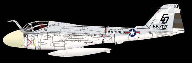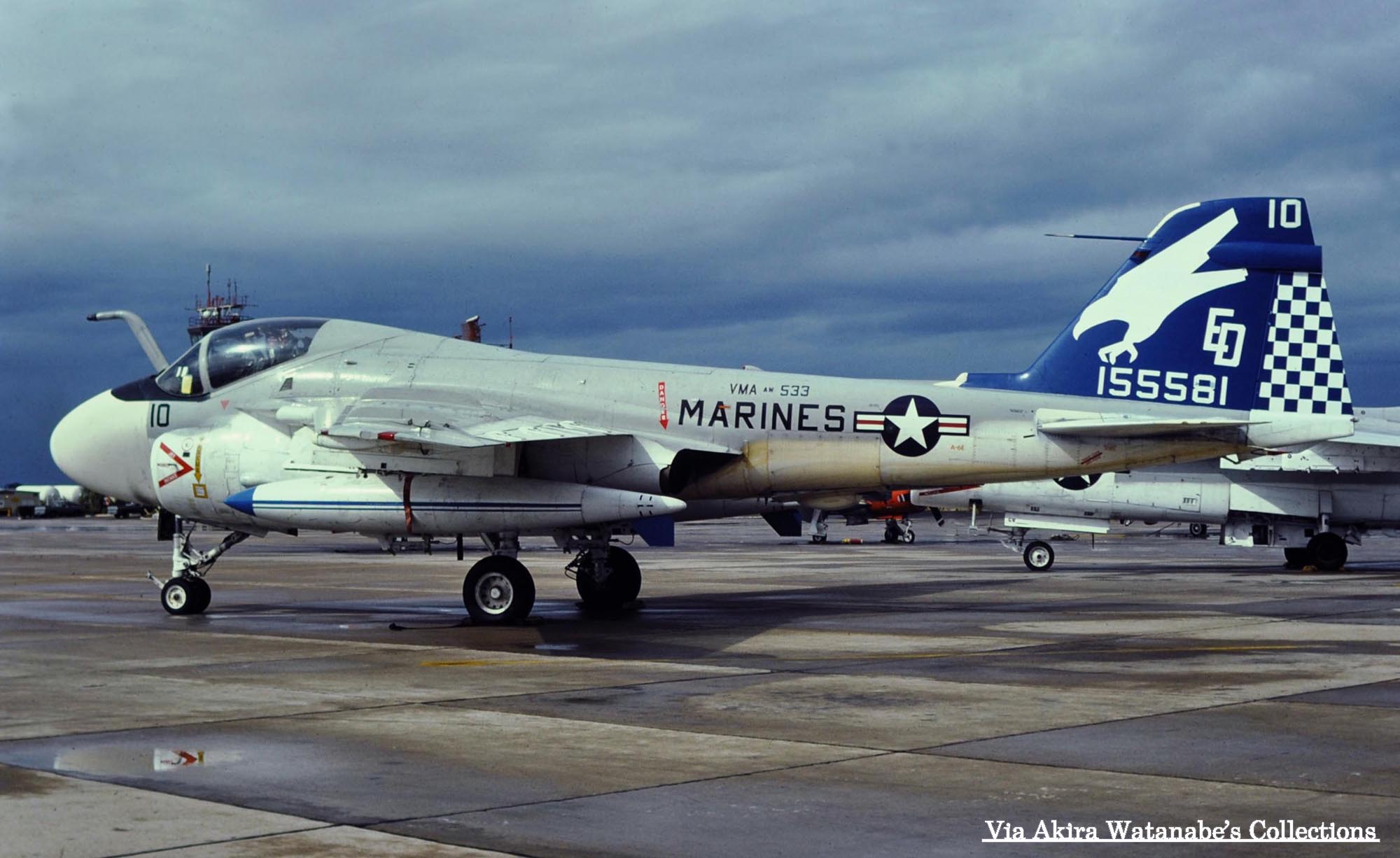 ↑ 1974年2月にミラマー航空基地で撮影されたVMA(AW)-533のA-6A/Bu.No.155581。この機体は、A型として生産され、E型に改造されたもので この部隊を離れた後、VMA(AW)-224に移動してWK-10となっている。。