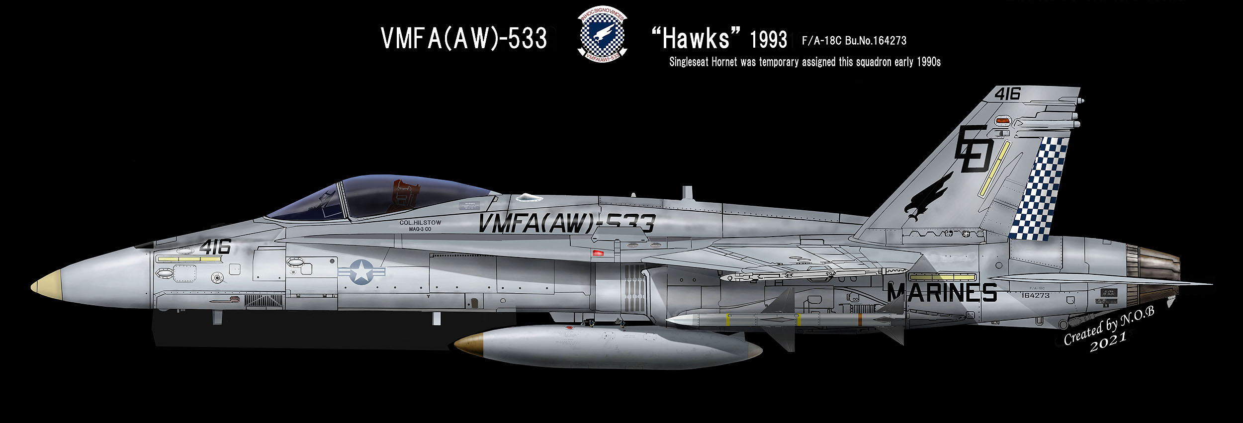 ↑部隊でF/A-18Dに機種交換が始まって間もなくの1993年6月にD型に混じり初期のC型が確認されており、Modexは416番をつけていた。ED-407との編隊飛行の写真やNASファロンでのC型単独の写真も残っており 一時配備とは言えVMFA(AW)の部隊では珍しかったはずである。尾翼ラダーのチェッカーはフルカラーで 外側にEDと大きく書かれていた。F/A-18C Bu.No.164273