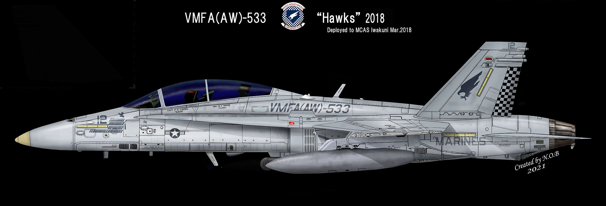 VMFA(AW)-533は、2008年3月20日にVMFA-312”DR"の後任として岩国基地に派遣された。実物を見た事はないが、飛行隊長指定機になっている”ED-01"は、往年のイントルーダーA-6時代のダークブルーにチェックの入った尾翼と”HAWKS"の文字が入った燃料タンクで一度は撮ってみたい機体だ。
