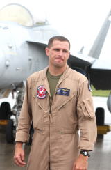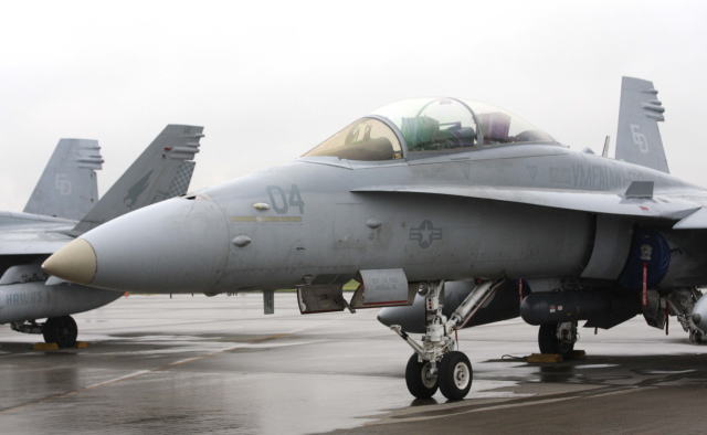 ↑ 2018年5月に岩国基地に配備された際のマーキングでイラストDと同じ 中東での作戦で投弾した59個の爆撃マークが入っている。配備早々横田基地にも飛来しておりマニアを喜ばせた。前席パイロットは、機体に描かれた“SUSAN”から女性であったようだ。F/A-18D BU.No.164967