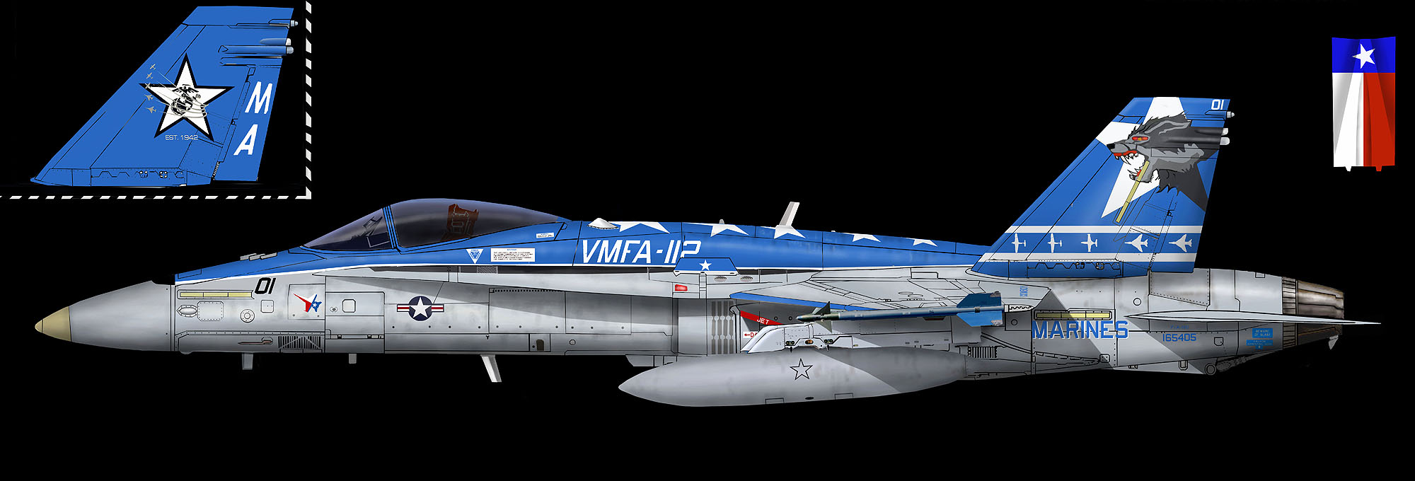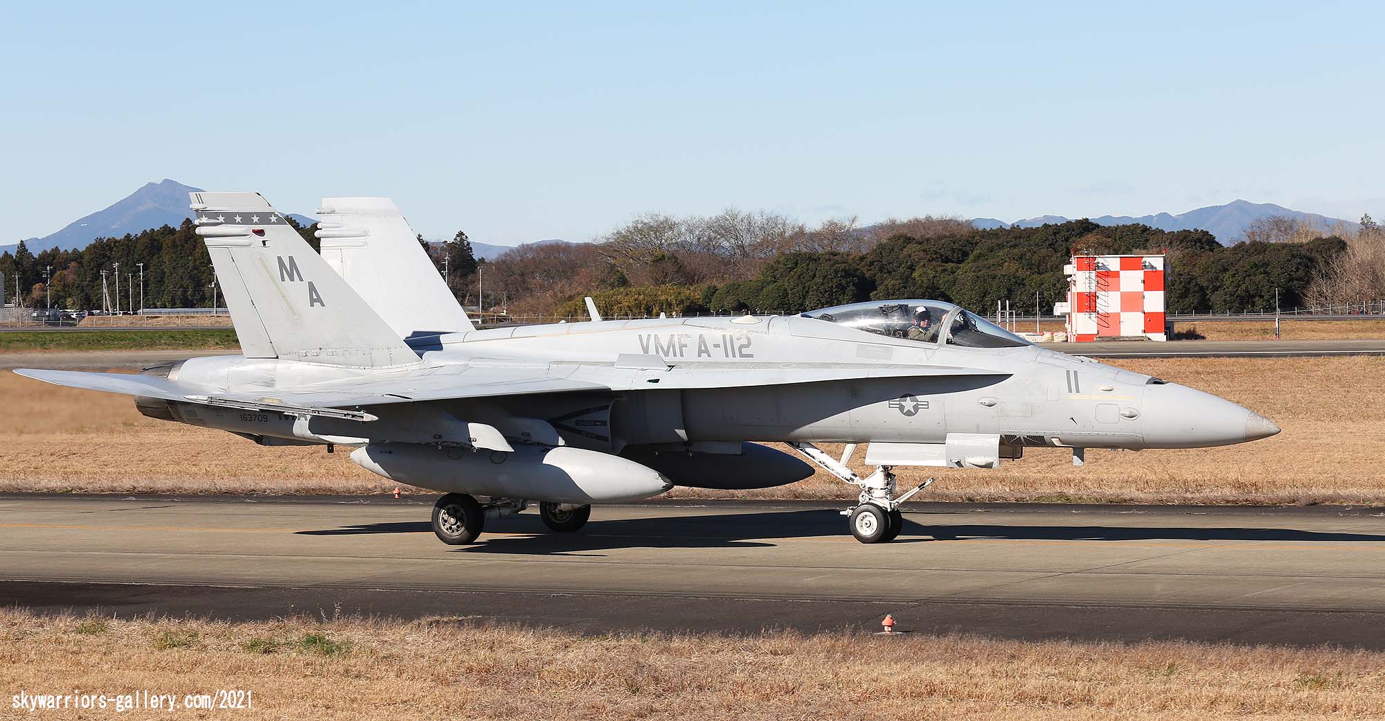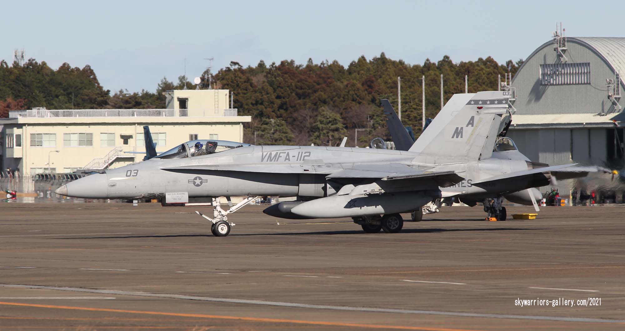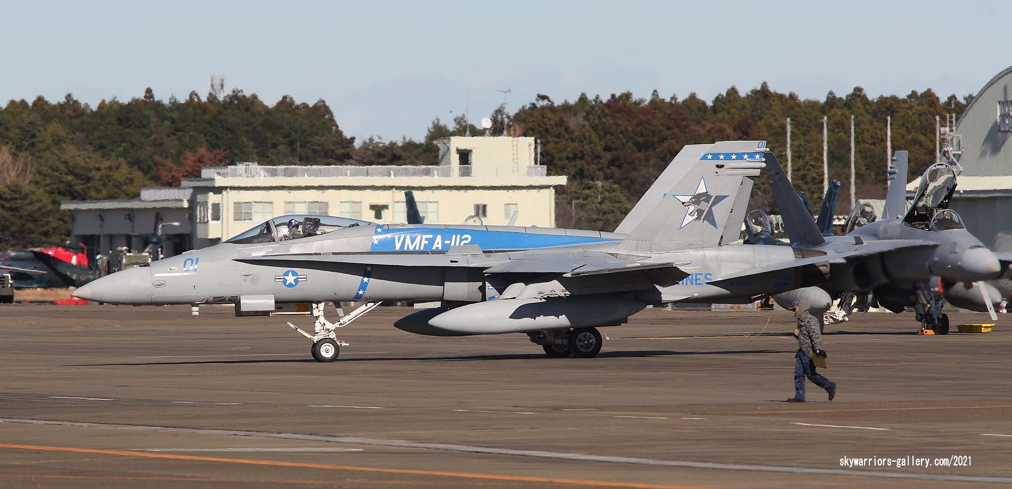 ↑ 2024年新たに塗装されたF/A18C MA-01 司令官指定機。尾翼の狼は2019年版のデザインを基本的に踏襲している。2025年に岩国に最後の派遣でVMFA-112が来るとも言われて、このマーキングが大いに期待されていたが・・・。
