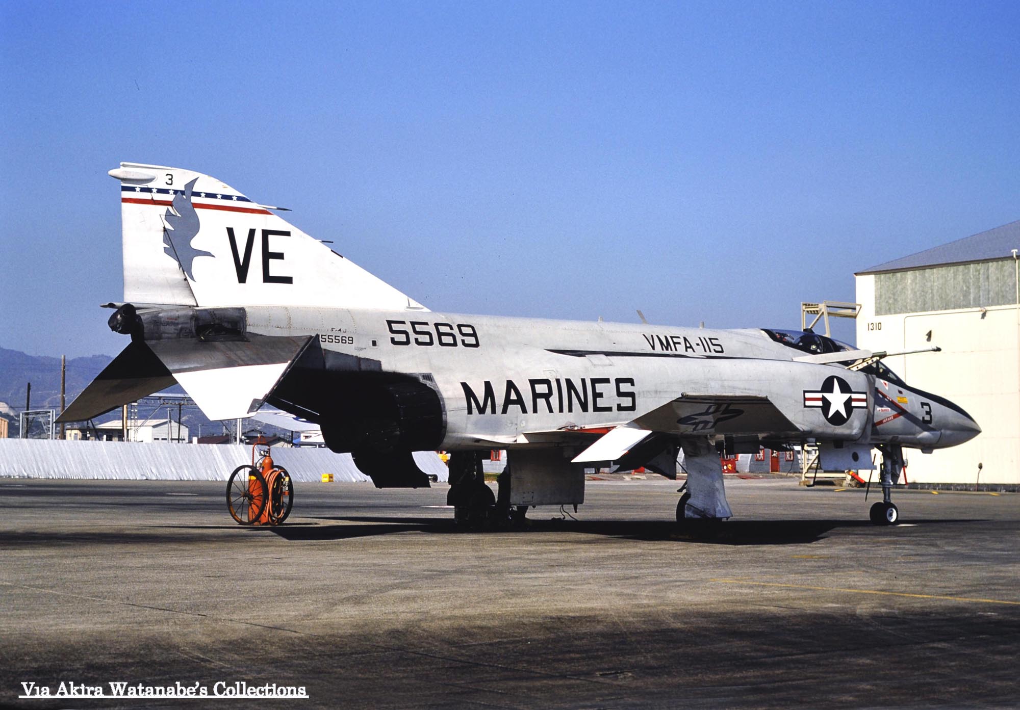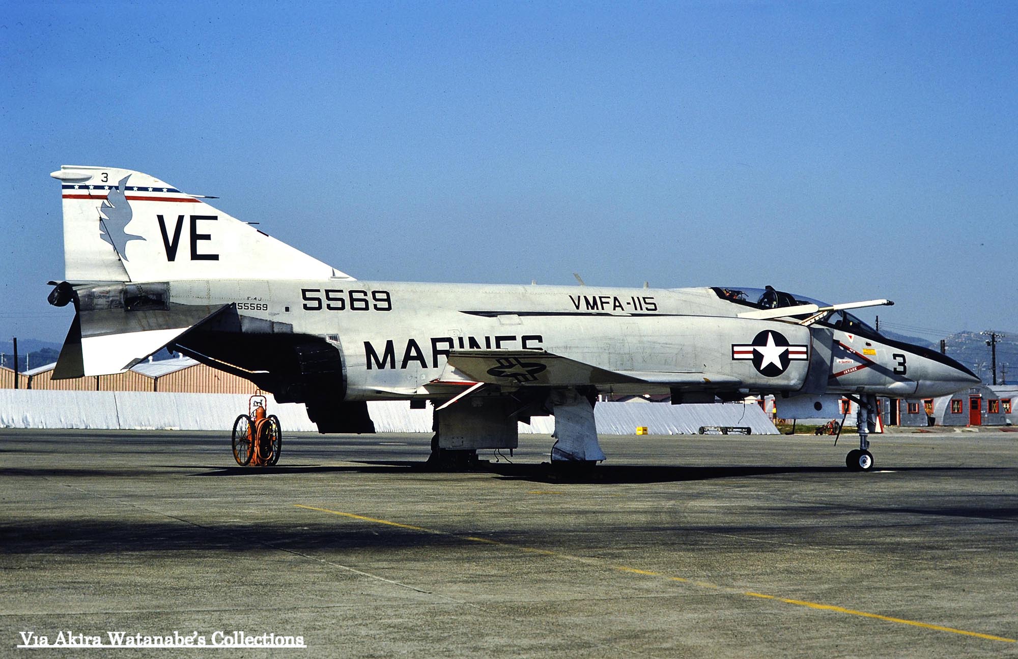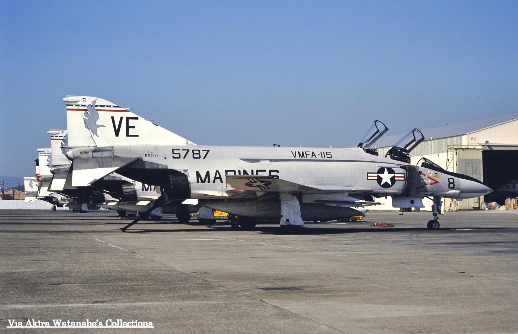 VMFA-115はベトナム戦争の前後も長期にわたり岩国基地に駐留していた為、同隊がF-4ファントムを使っていた時期は、日本の軍用機マニアには最もなじみ深い部隊の一つであった。私個人的にはこの部隊との縁が薄かったのか、撮影の機会にはあまり恵まれなかったが、シンプルで美しいマーキングは常に海軍/海兵隊航空マニアの憧れの的であった。以下はVMFA-115のF-4J時代の思い出話である。
