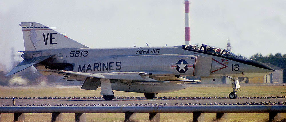 ↑ 続けて降りてきたVMFA-115のF-4J/VE-13。始めてファインダーを通して見た真っ白い尾翼が眩しかった。岩国基地にいたもう一つの部隊VMFA-232