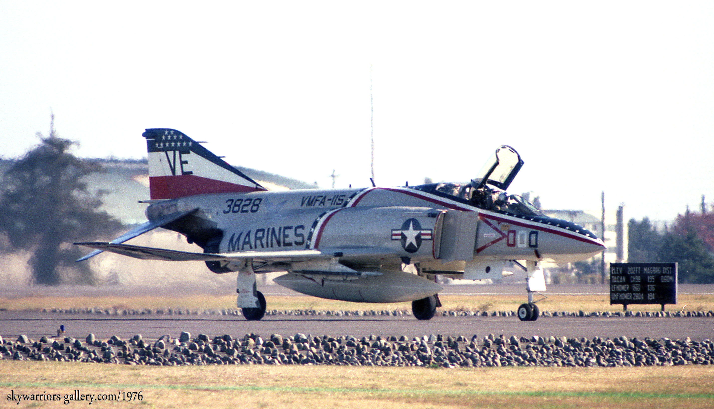 1976年の別の日に同じ場所で撮影したVMFA-115のF-4J/VE-7/Bu.No.155772。VMFA-115がテールコードを”VE”にしたのは1957年だそうで、それまでは”AE”を使っていた。F4D-1を使用していた1958年ごろに台湾海峡の金門島/馬祖で大陸中共と台湾との間の紛争が勃発、VMFA-115は台湾からの補給路を防衛する役割を負っていた。