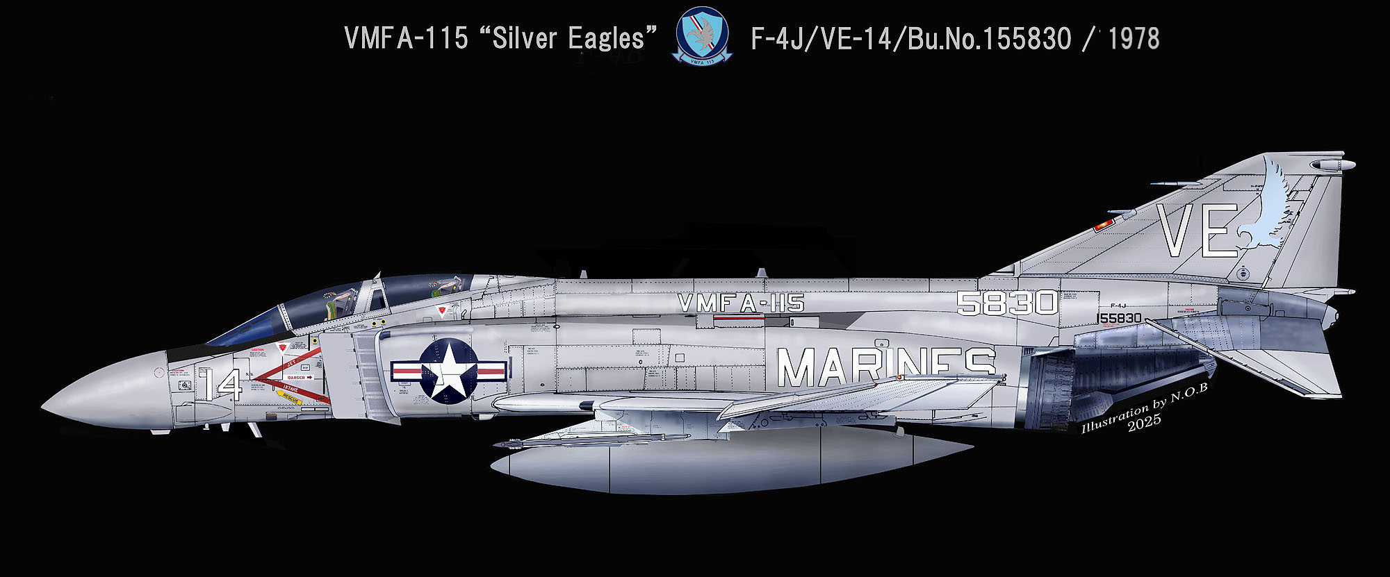 ↑ 1978年ロービジ化されたVMFA-115の新マーキング。尾翼のイーグルのデザインは大幅に変更されていた。文字類は全て黒枠付の白色で統一された。F-4J/VE-14/Bu.No.155830