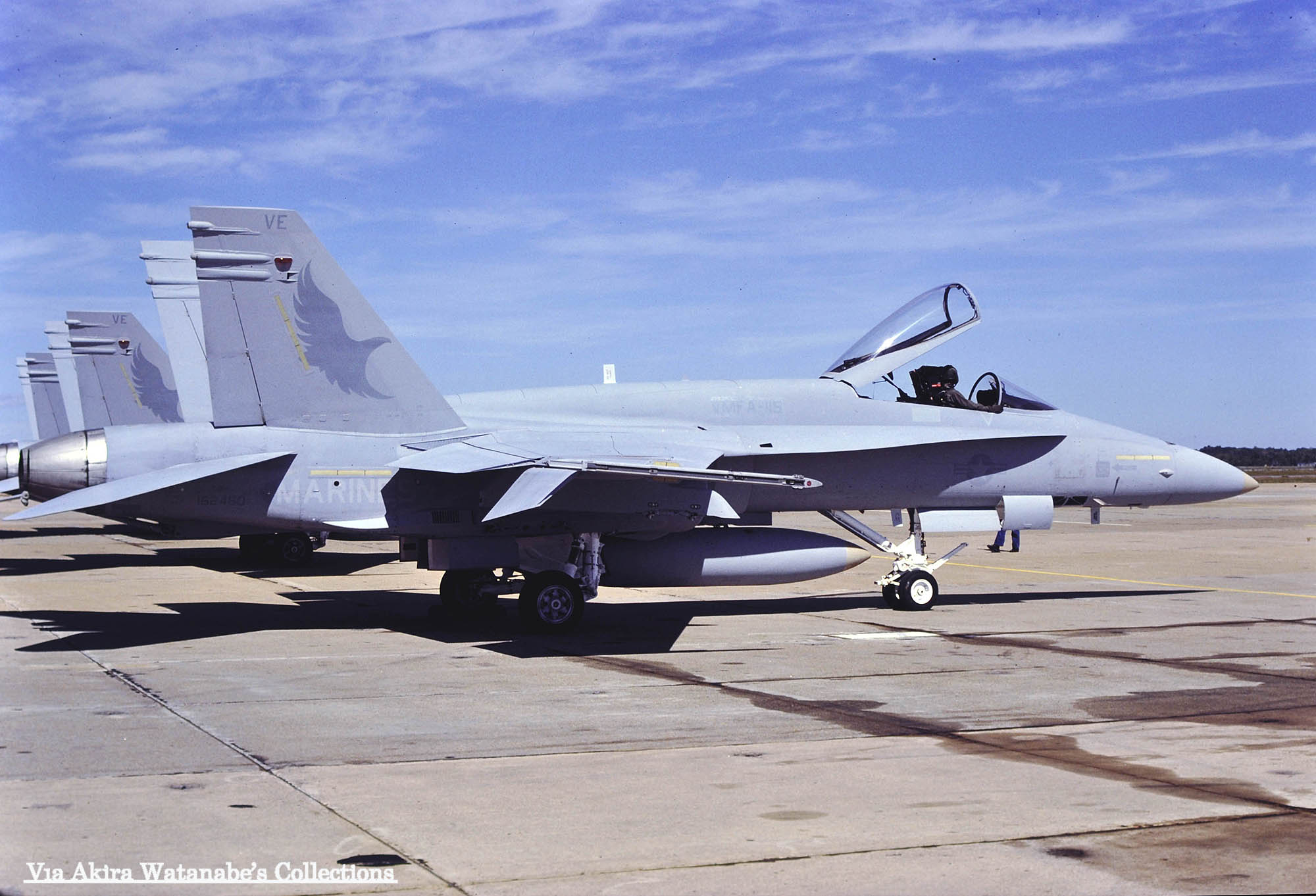 ↑ 1993年10月 厚木基地に飛来したVMFA-115のFA-18A/VE-08。私が初めて撮影したVMFA-115所属のFA-18Aだったと思う。ビューアルナンバーは読み辛いが末尾が164なので、163164だと推測。