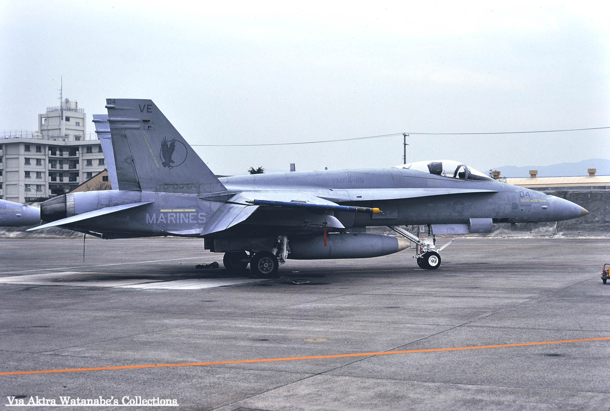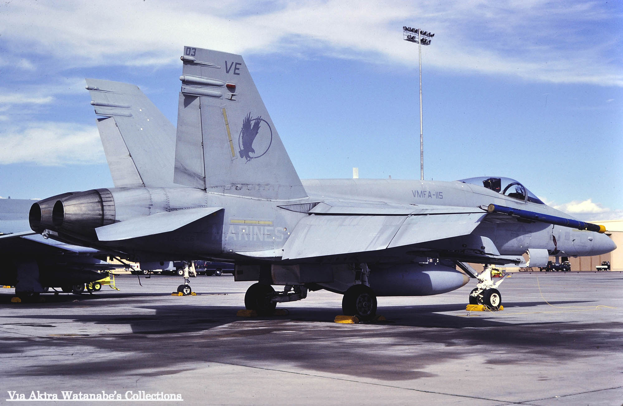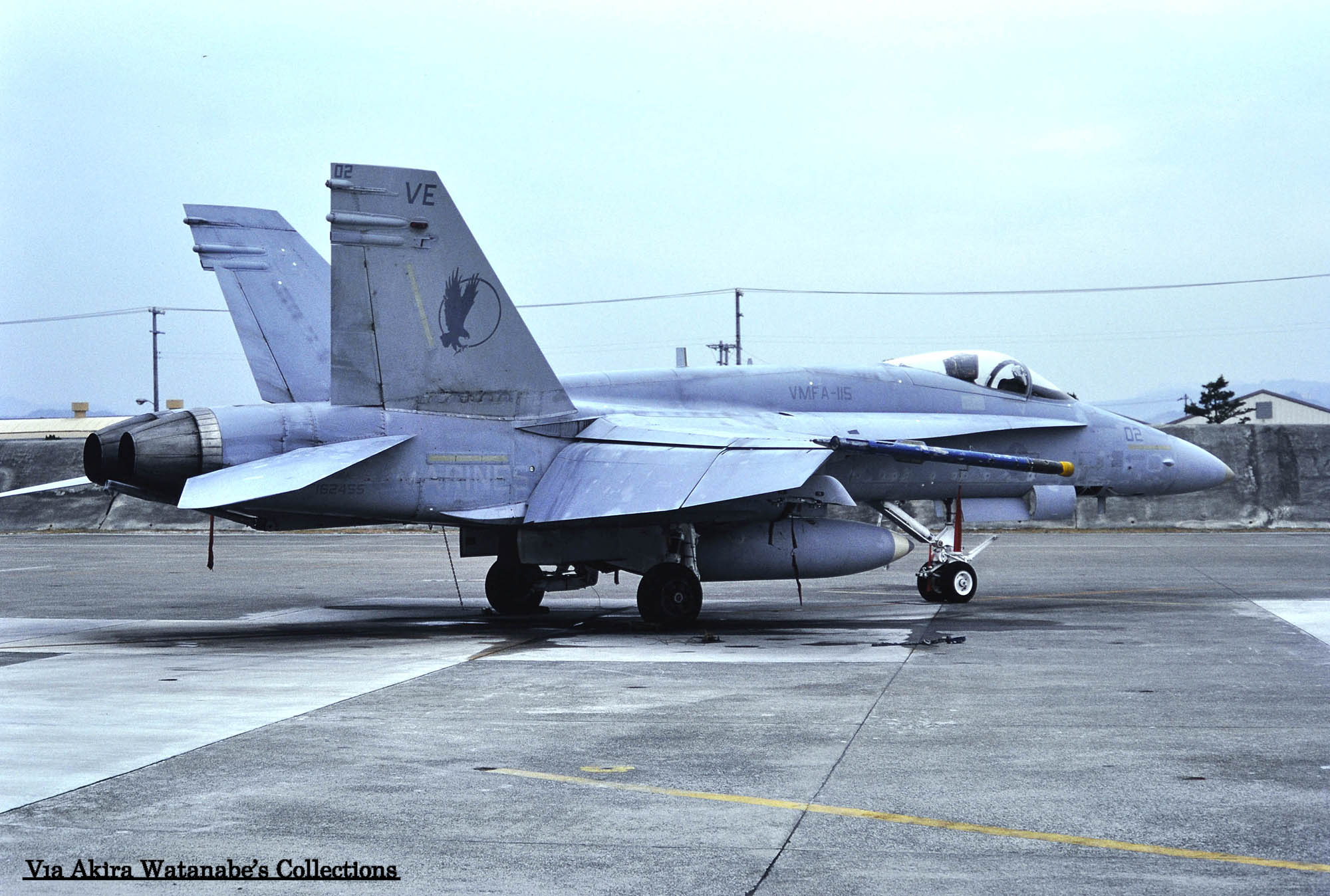 ↑ 1985年9月に撮影されたVMFA-115のF/A-18A/Bu.No.162460。撮影場所は不明であるが、恐らくアメリカ本国でのもので、機首番号もまだ未記入である事から、出荷された機体が部隊に到着して間もない頃の写真であろう。尾翼のイーグルも最初はこのようなデザインで塗装されていたと言う貴重な記録である。因みにこの機番のFA-18Aは日本に最初に派遣された時、”VE-07”とされている。