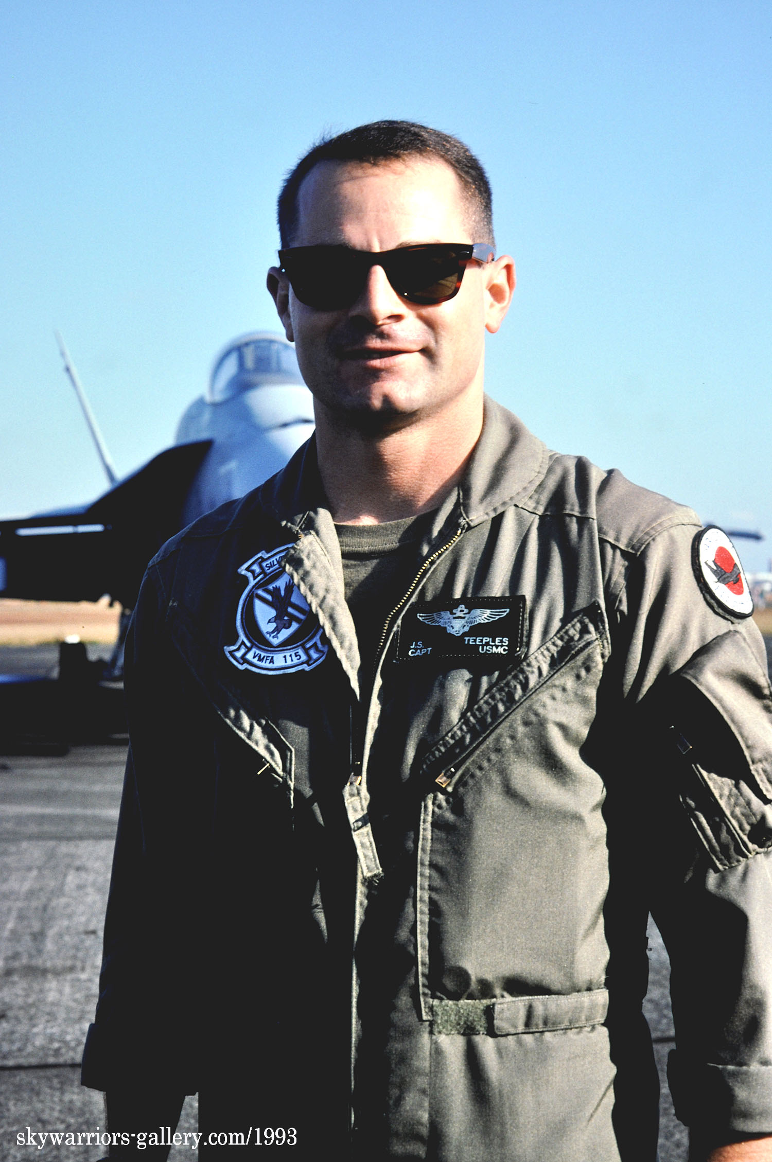 ↑1998年頃のVMFA-115司令官指定機で尾翼に部隊インシグニアを丸丸挿入したタイプ。燃料タンクにもトリトコール(三色旗)と部隊ニックネームが入っている。F/A-18A/VE01/Bu.No.163175