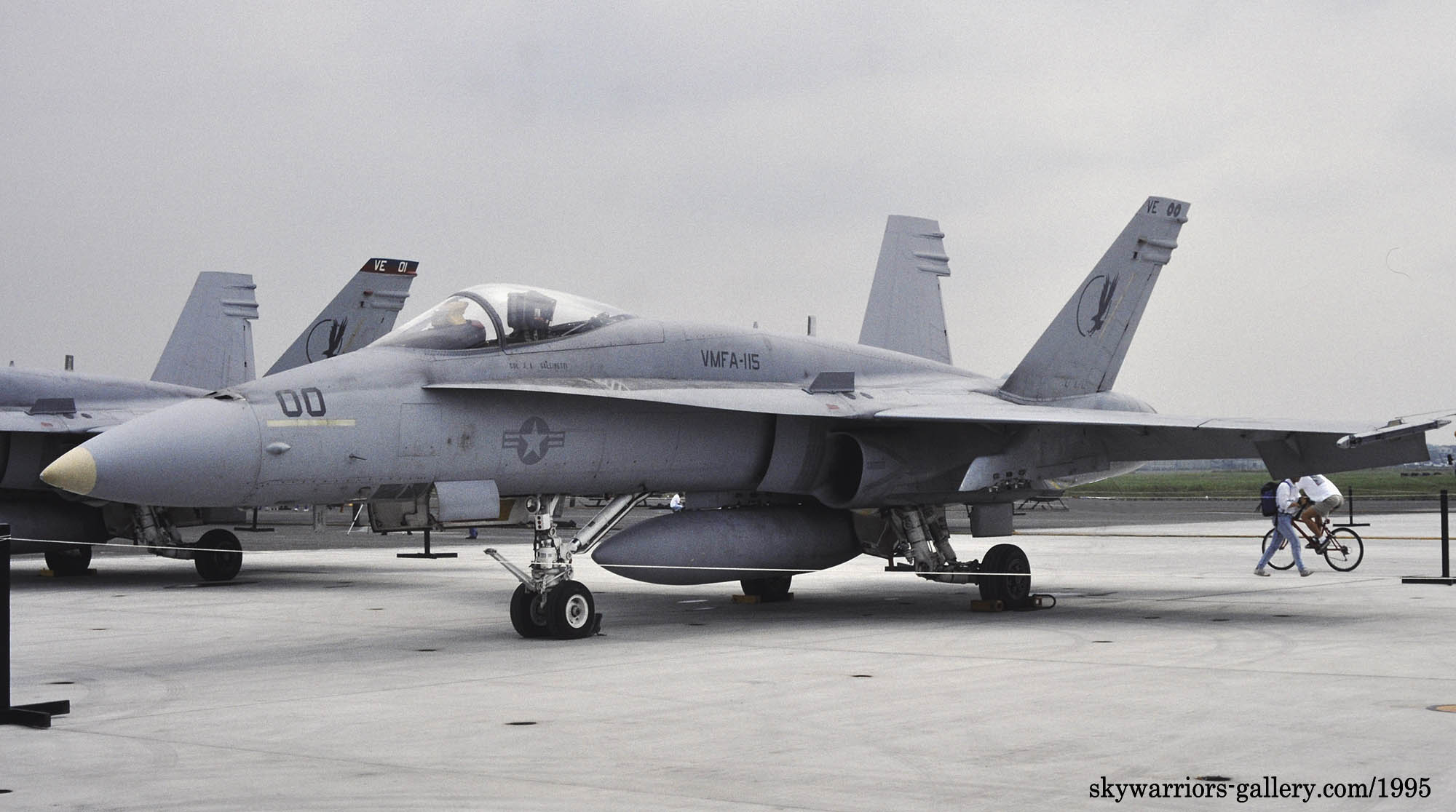 ↑ 1995年厚木基地で展示された2機のFA-18A。VE-00は尾翼のチップにダブルナッツが書かれているが、VE-01の方が派手なのは、司令官指定機となっている為で、01を指定機にするのはこの時機から部隊の伝統となったようだ。