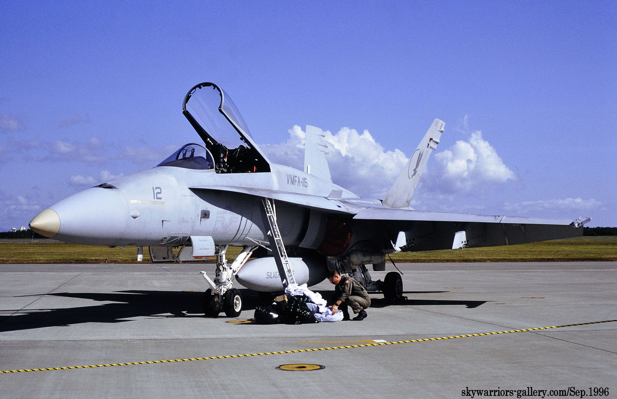 ↑ 1996年9月の三沢基地航空祭に展示されたVMFA-115のFA-18A/BM-12。各所に書かれた番号等は字体も細く、また色も薄い。