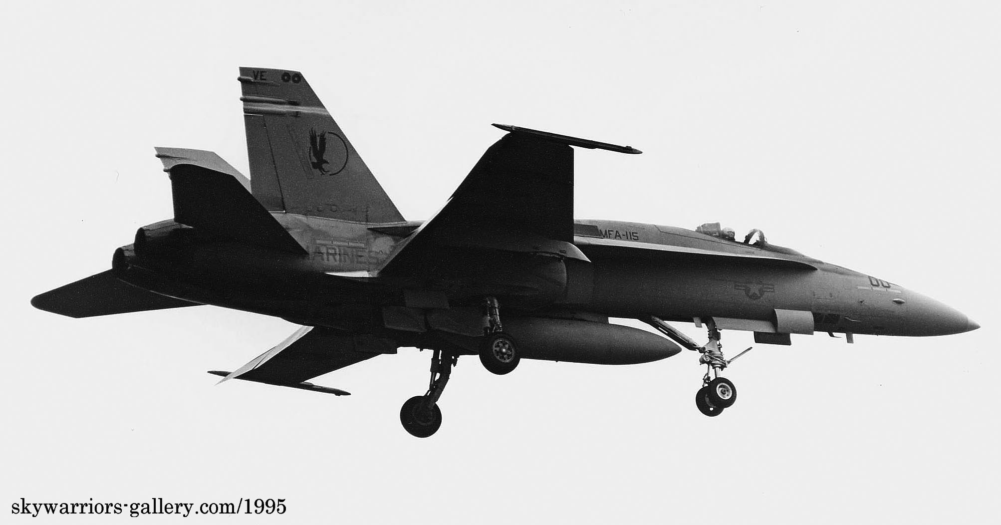 ↑ 1995年春 厚木基地R/W-19に降り立つVMFA-115のFA-18A/VE-00。尾翼チップの”00”がボルト締めに使われるナットの形になっており、米海軍のマーキングのお遊びの伝統でもある。”00”はダブルナッツと呼ばれる。