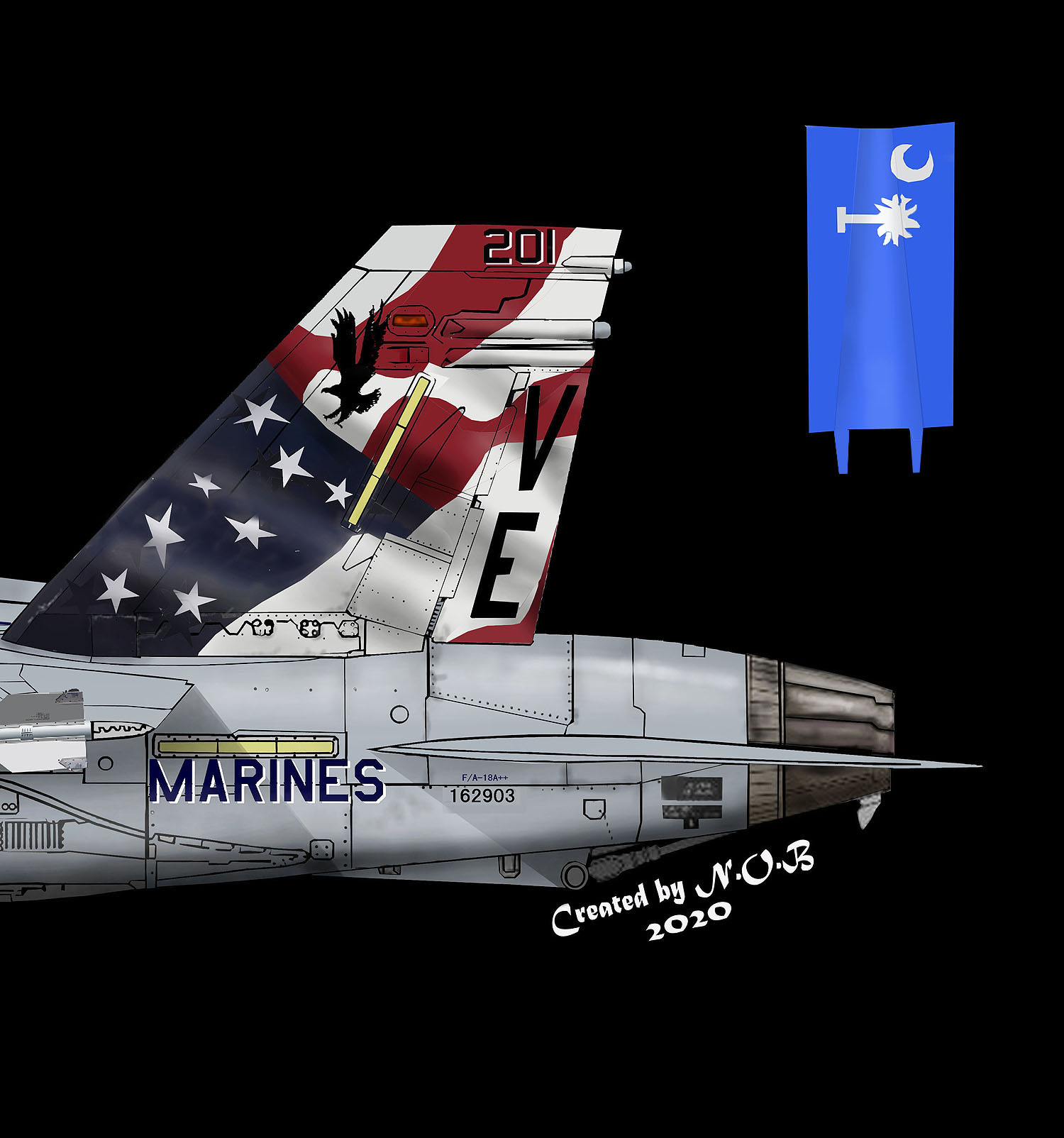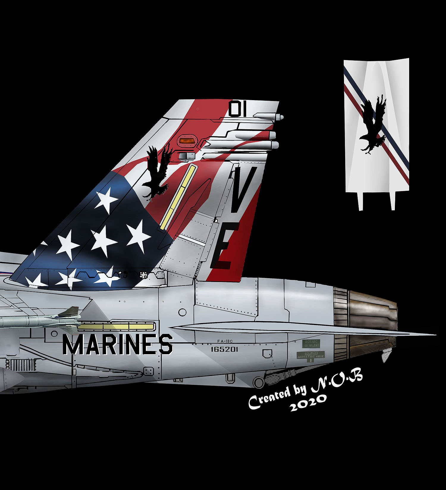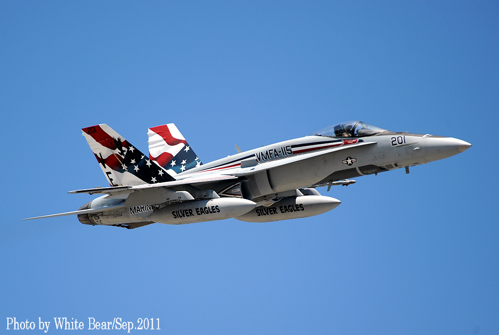 ↑ 2011年9月に再びVMFA-115のFA-18A++12機が岩国基地に飛来した。今回はVE-201/Bu.No.162884は最初から星条旗のマーキングを入れており、このマーキングでは第2代目となる。FA-18Aは、+が++に更新されている事に注意