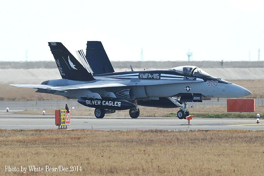 ↑ イラストでも開設したが、2013年までVMFA-115は中東のバーレーンに派遣されており、そのバーレーンでも確認された黒のFA-18A++が岩国にもやって来た。従来とは全くコンセプトの違うマーキングではあるが、約10年後の2023年に同じマーキングがFA-18D複座型に施される事になった。White Bear さん撮影