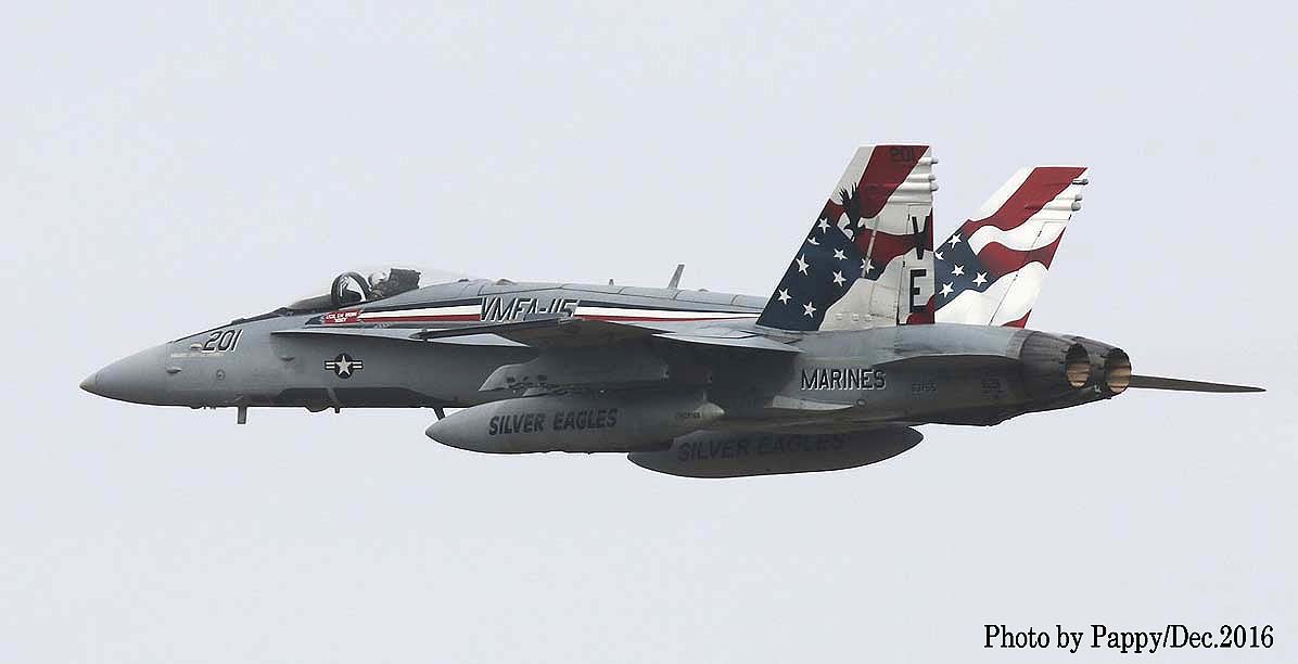 ↑ 2016年12月4日 横田基地を離陸する4機のブレード。写真は、友人故PAPPYさんから送って頂いたもの。前日3日15:45分に横田基地に飛来したVMFA-115の4機のFA-18は、ローカルフライトも無しに翌日横田を離れた。その後、離陸した4機の内、唯一のC型であった星条旗マーキングのVE-201/Bu.No.163755は事故で失われパイロットの死亡が確認されたそうで、ご冥福を祈りたい。尚 上のイラストの機体は、この機体が失われた4年後に来日した際のものである。
