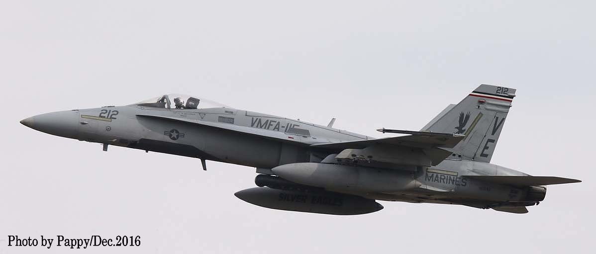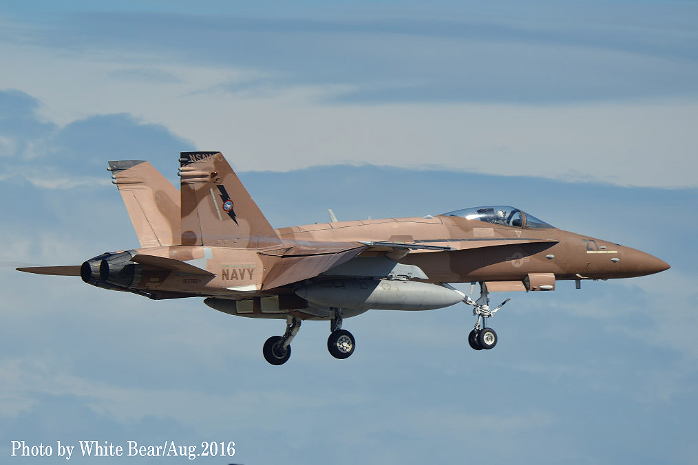 ↑ 前項でご説明した2016年に岩国基地に展開したVMFA-115の12機のFA-18の中に、2機のC型が含まれており、墜落したVE-201/Bu.No.163755とこの迷彩のFA-18がそうであった。NSAWCで使われていた機材を補充で当てたものと思われ、岩国ではVE-27号機として扱われた。White