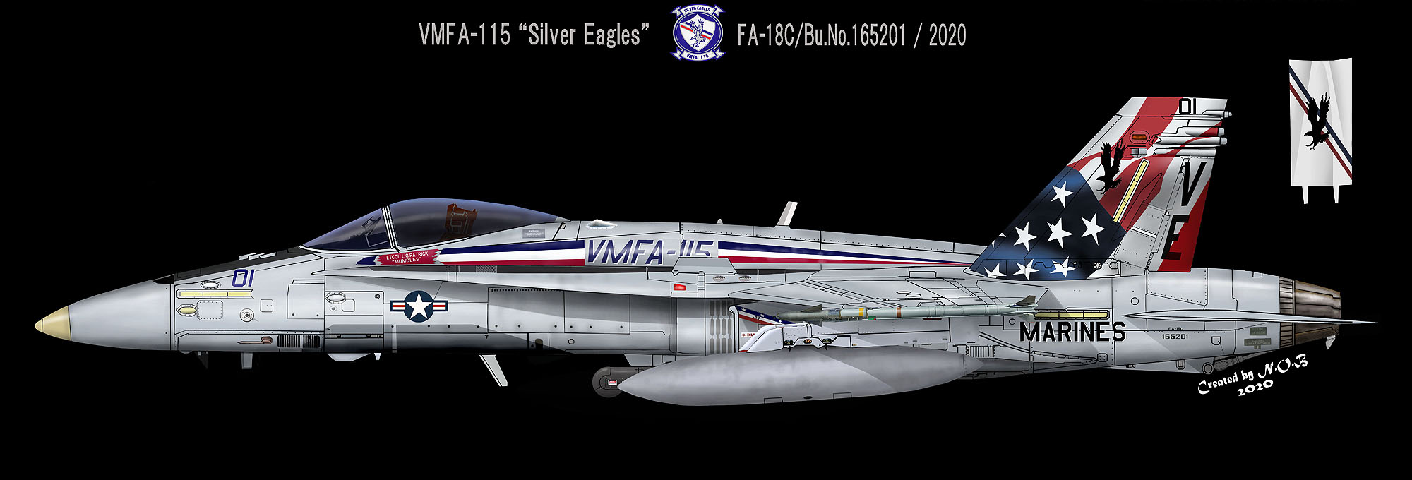 ↑2020年版VEのショーバード。2009年版、2013年版とほぼ同じデザインを復活したものであるが、星条旗のたなびき方や書かれた星の数が微妙に違うので、良く見ると新しいマーキングである事が分る。Modexも久々に「01」が復活した。最も大きな違いは、機体がA型からC型になった事である。 FA-18C Bu.No.165201