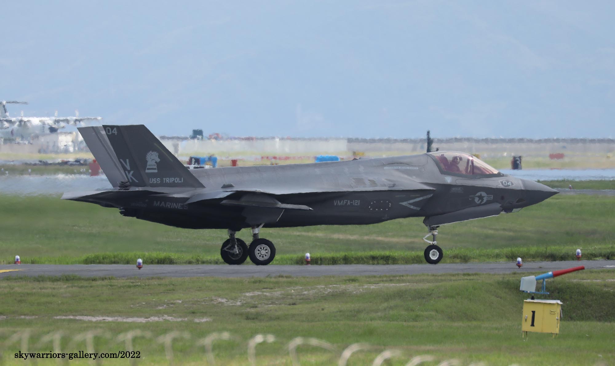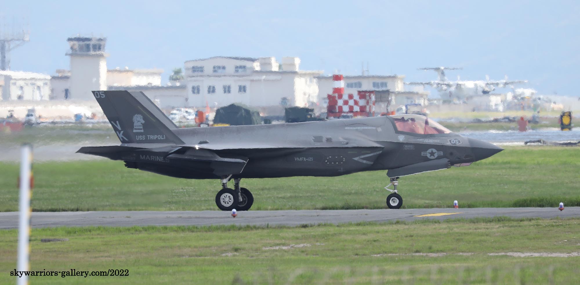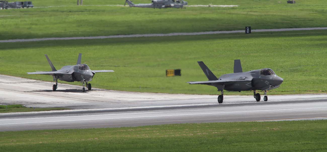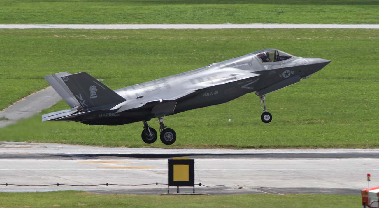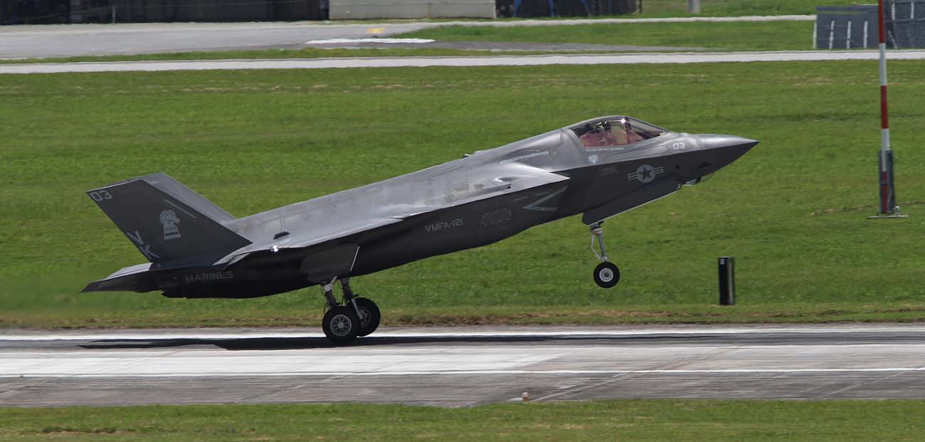 2017年7月6日 朝、ランウェイR/W23・・・当然 沖縄梅雨明け後の南風。私は、県道沿いの公園でF-16Cの着陸を待っていた。和田先輩が、「今、岩国をF-35Bが離陸し、こちら嘉手納基地に向かっている」との情報をくれた。後1時間ほどで到着するはず。7月6日10:35 2機のF-35Bは降りたが、R/W23-left で降りを待っていた私は、R/W23-right降りするF-35Bに対応しきれず、撮れないで見逃した。その日の午後この2機は離陸の為ランウェイをクロスしてこちらに向かってくるので、道の駅前をタキシーするのかと期待したが、そのままランウェイに入り離陸して行った。しかし、最後にローカルフライトをやってくれたお陰で、漸く道の駅でランディングを撮ることができたのである。