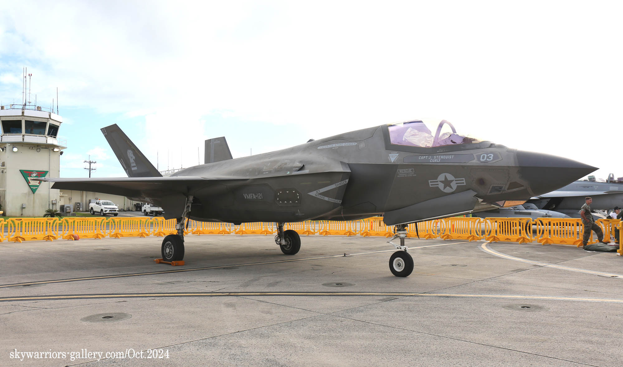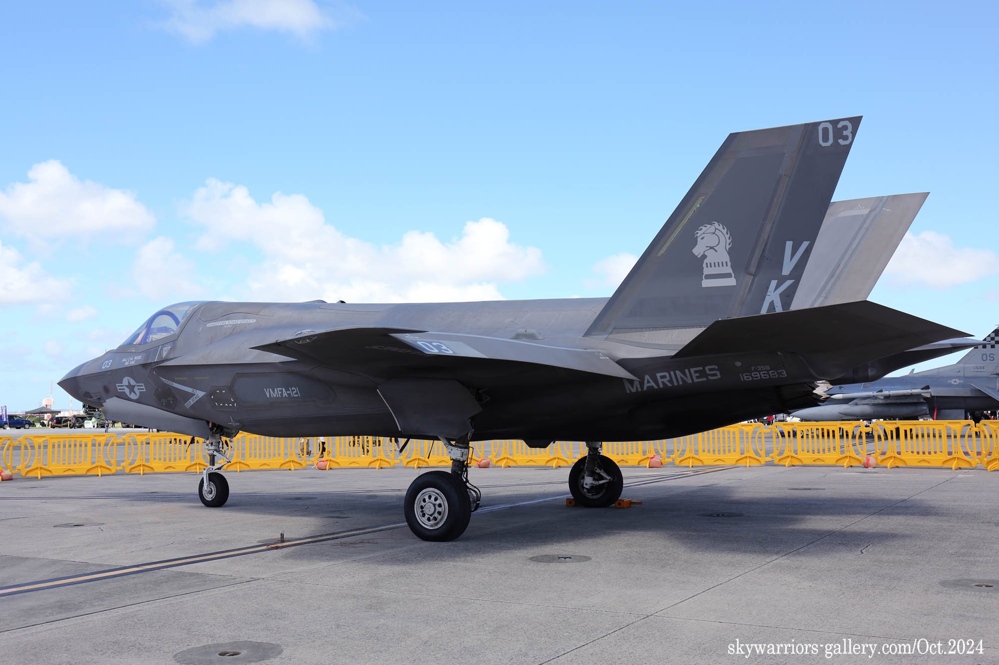 ↑ 2024年10月に開催された普天間基地開放で展示されたVMFA-121のF-35B/Bu.No.169683。この機体だけ作に囲まれていたのは、ステルス機で最新鋭の為だろうが、アメリカ本国でも既に観客が触れる状態での展示が始まっているので、何れそうなるのかもしれない。