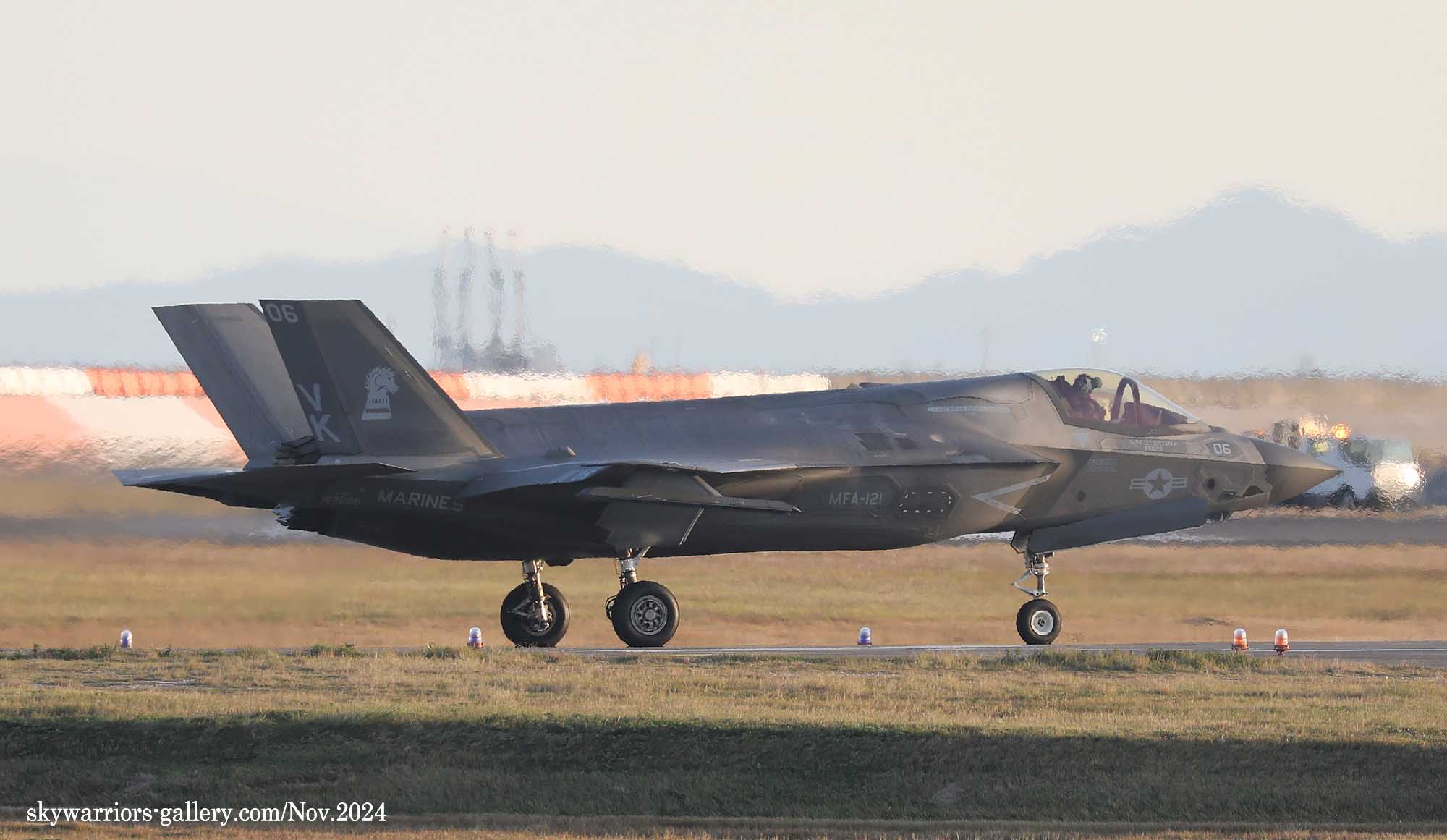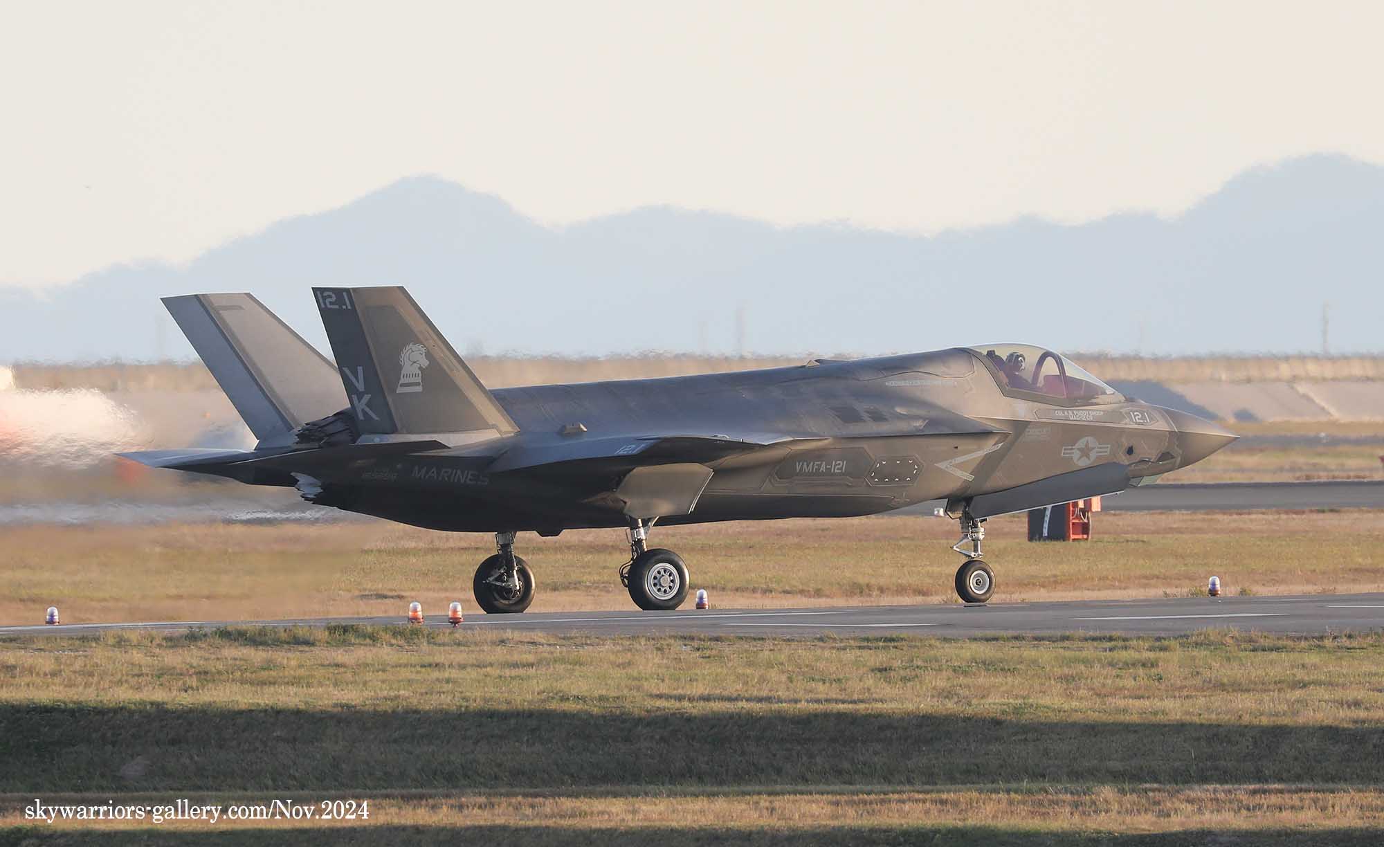 ↑ 尾翼と機首のModexに何故か”12.1”と書かれたVMFA-121のF-35B/VK-12番機。夕日を浴びてボディが黄色く輝くが、この時間は陽炎が無いので機体がすっきりと撮影できる。