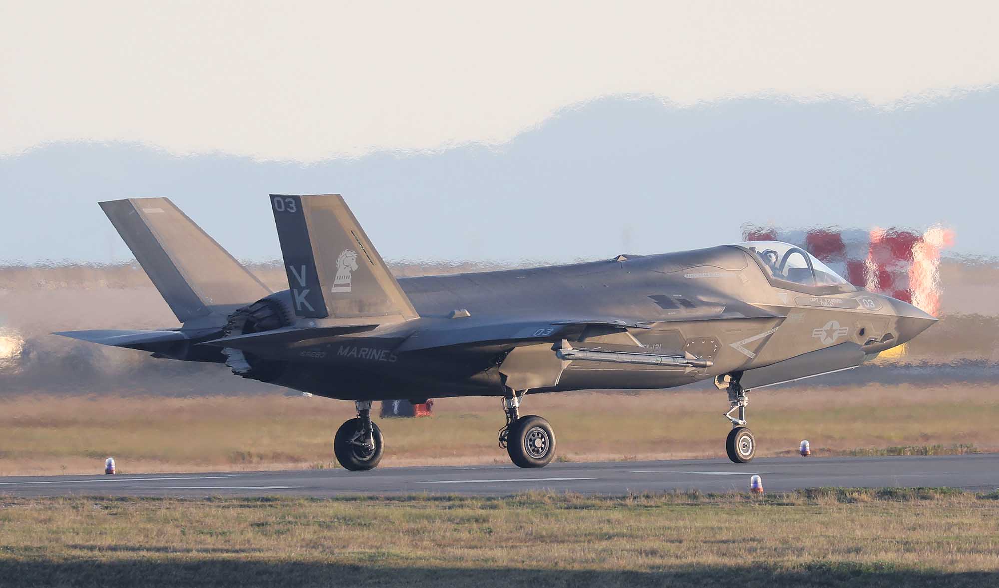 ↑ タキシーするF-35B/VK-12の後方には、ランウェイ脇でホットピットを行うF-35B/VK-06の姿。エンジンをかけたままで給油作業して、速やかに再出撃するホットピット訓練は、最近海兵隊が最も力を入れている項目のようだ。