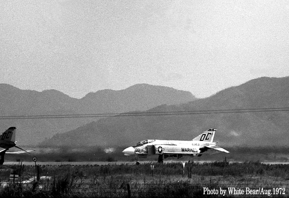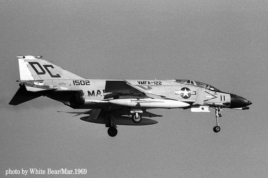 ↑White Bearさんが1969年3月に厚木基地に着陸するVMFA-122のF-4B。同隊は白いレードームの機体が多かった中で、レードームが黒く塗られた比較的珍しい機体である。