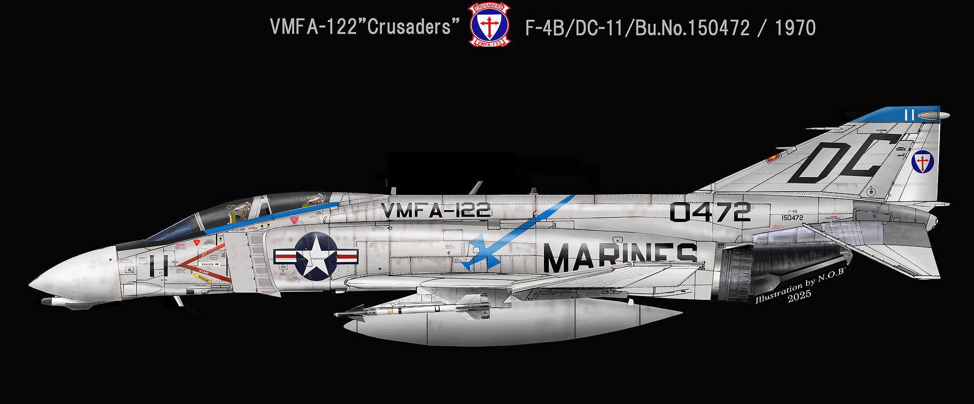 ↑ 1972年8月White Bearさんが岩国基地で撮影されたVMFA-122のF-4B。この機体は、司令官指定機DC-00であるが、この時期同隊のF-4Bのテールコード”DC"には白いシャドーがかかっている。