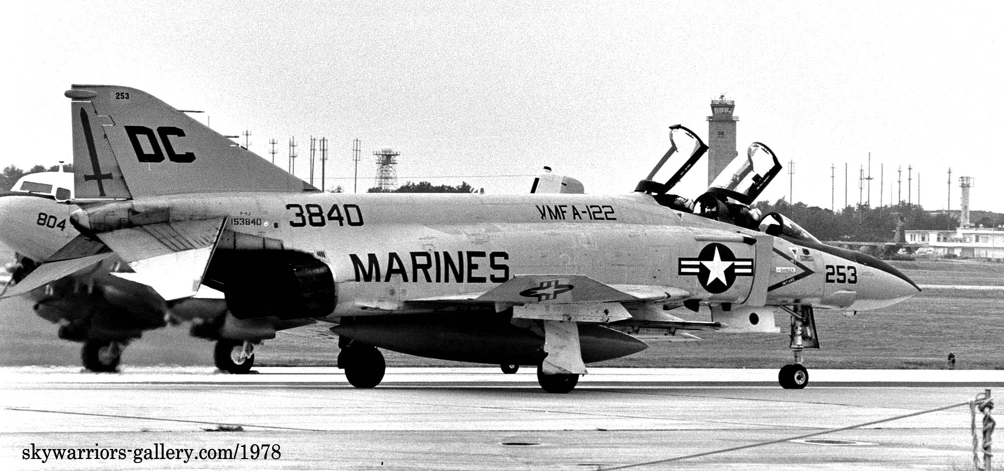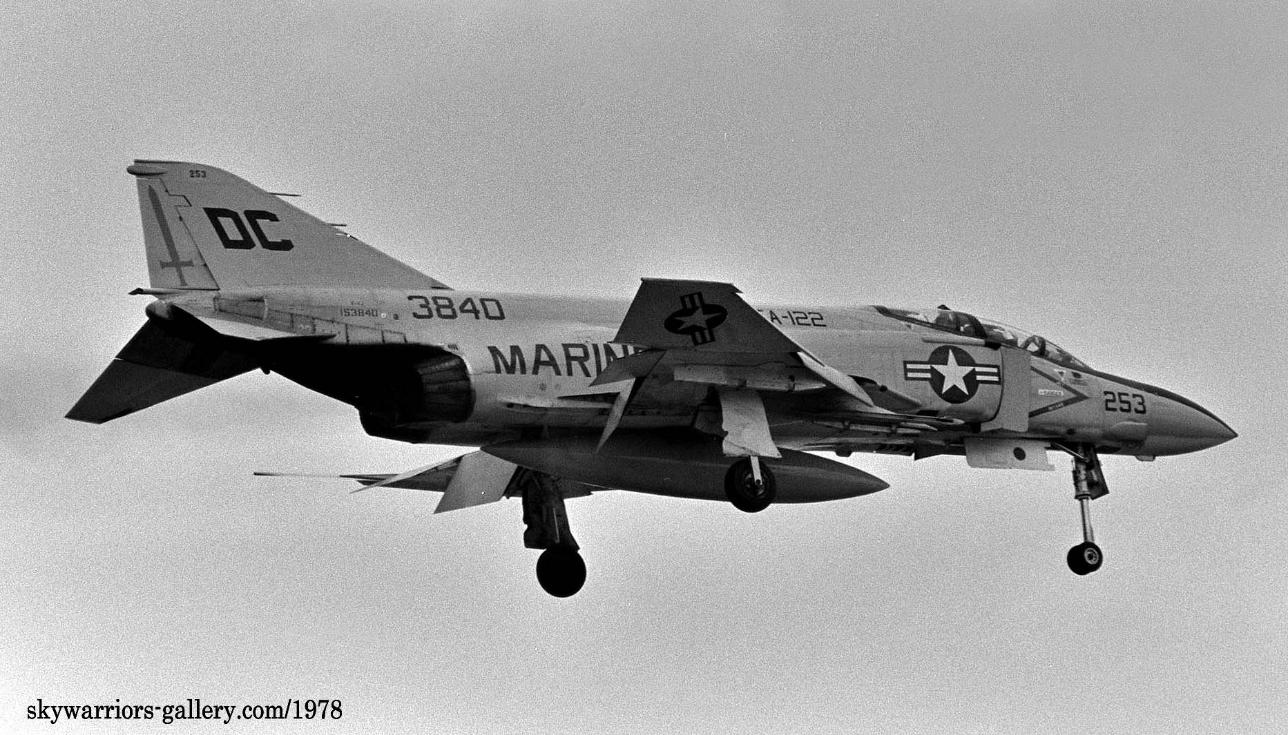 ↑ 1978年9月訓練を終え嘉手納基地に戻ってきたVMFA-122のF-4J/DC-253/Bu.No.153840。この機体は後にS型に改造されて、当時厚木をベースにしていたVF-161に配備された。