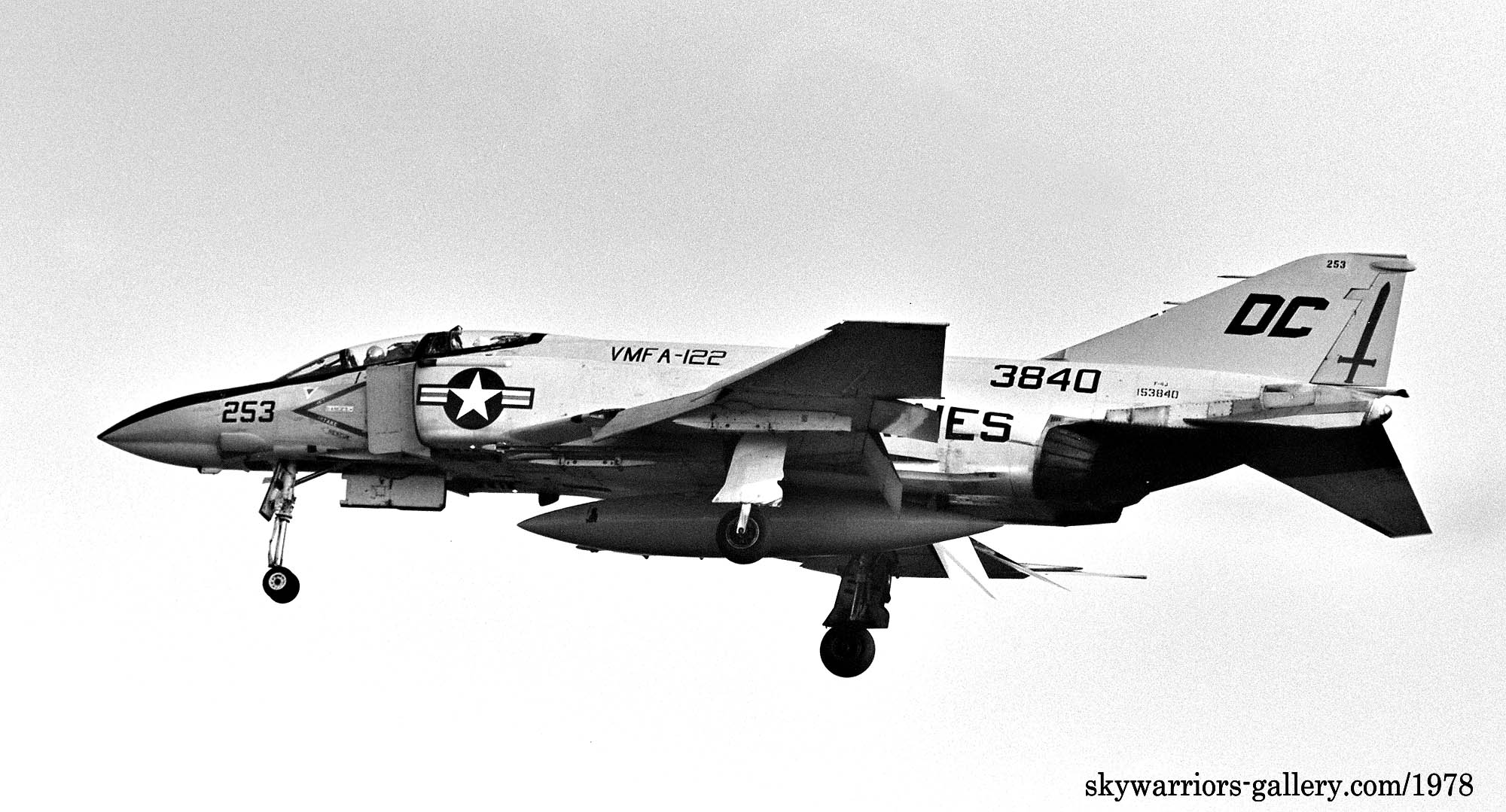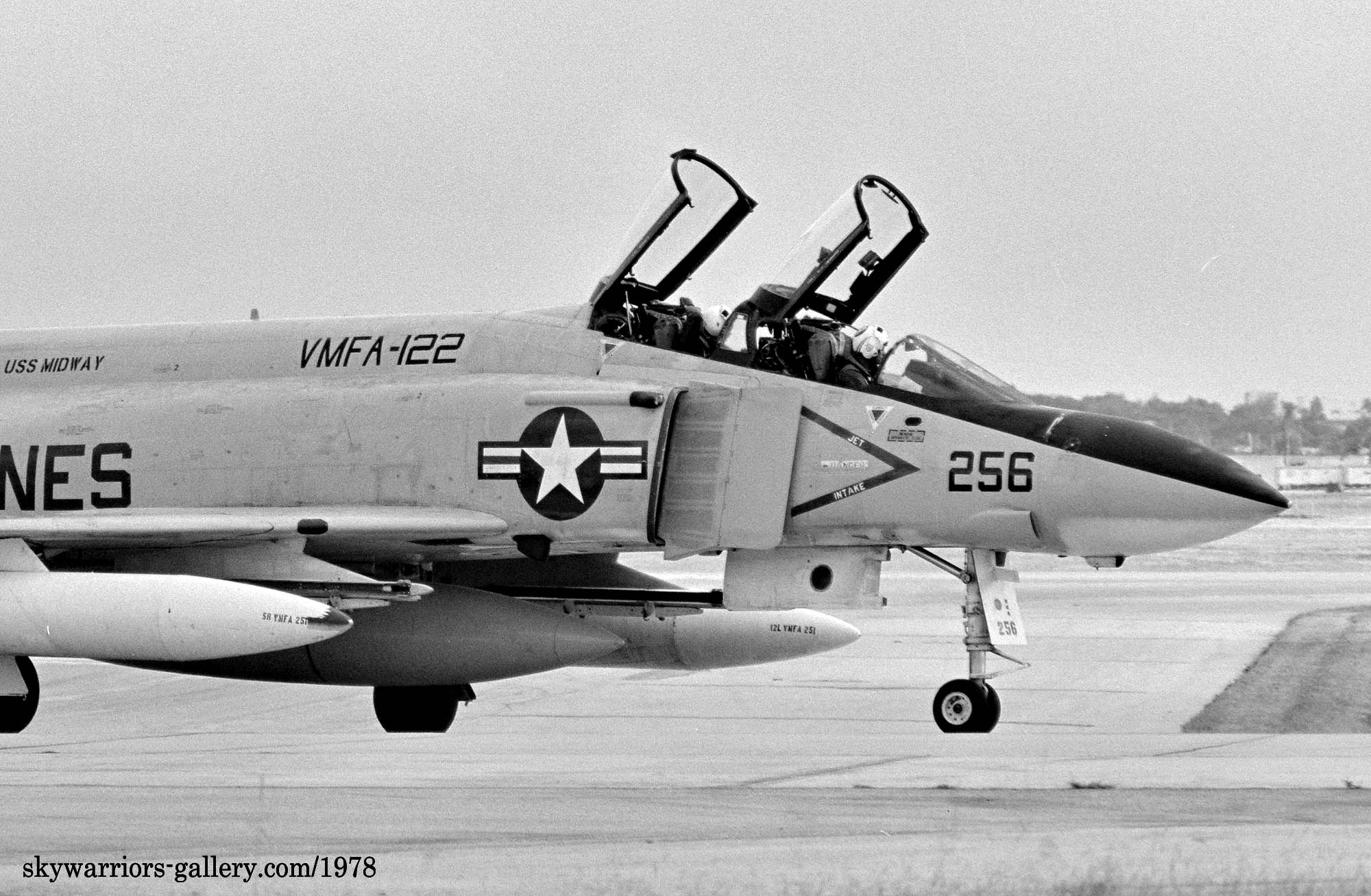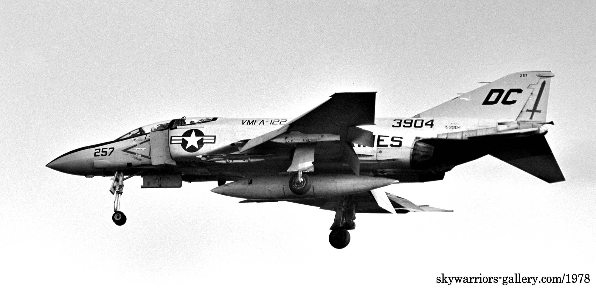 VMFA-122がF-4Jを装備してから初めての岩国基地派遣が1978年7月で、翌年7月までの1年間の駐留期間であった。私が彼らに初めて出会ったのは、1979年7月に岩国のMAG-15に配備された後になるが、1978年9月の嘉手納行と1979年7月の嘉手納行の2回撮影のチャンスがあった。当時VMFA-122のF-4Jはラダーに蒼い剣のマークを入れただけのシンプルな塗装だったが、1年の日本滞在の間に彼らを可能な限り撮りたいと嘉手納基地周辺で駆け回った。彼らはF-4Sに移行した後まもなくFA-18Aに更新した。VMFA-122は1986年にF/A-18Aに機種転換し、VMFA-314についで海兵隊で2番目のホーネット飛行隊となった。ローテーションで岩国にも来るようになり撮影の機会も増えた。