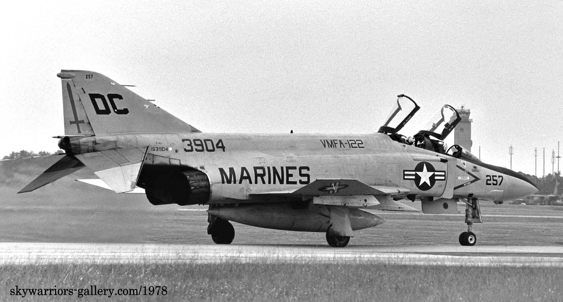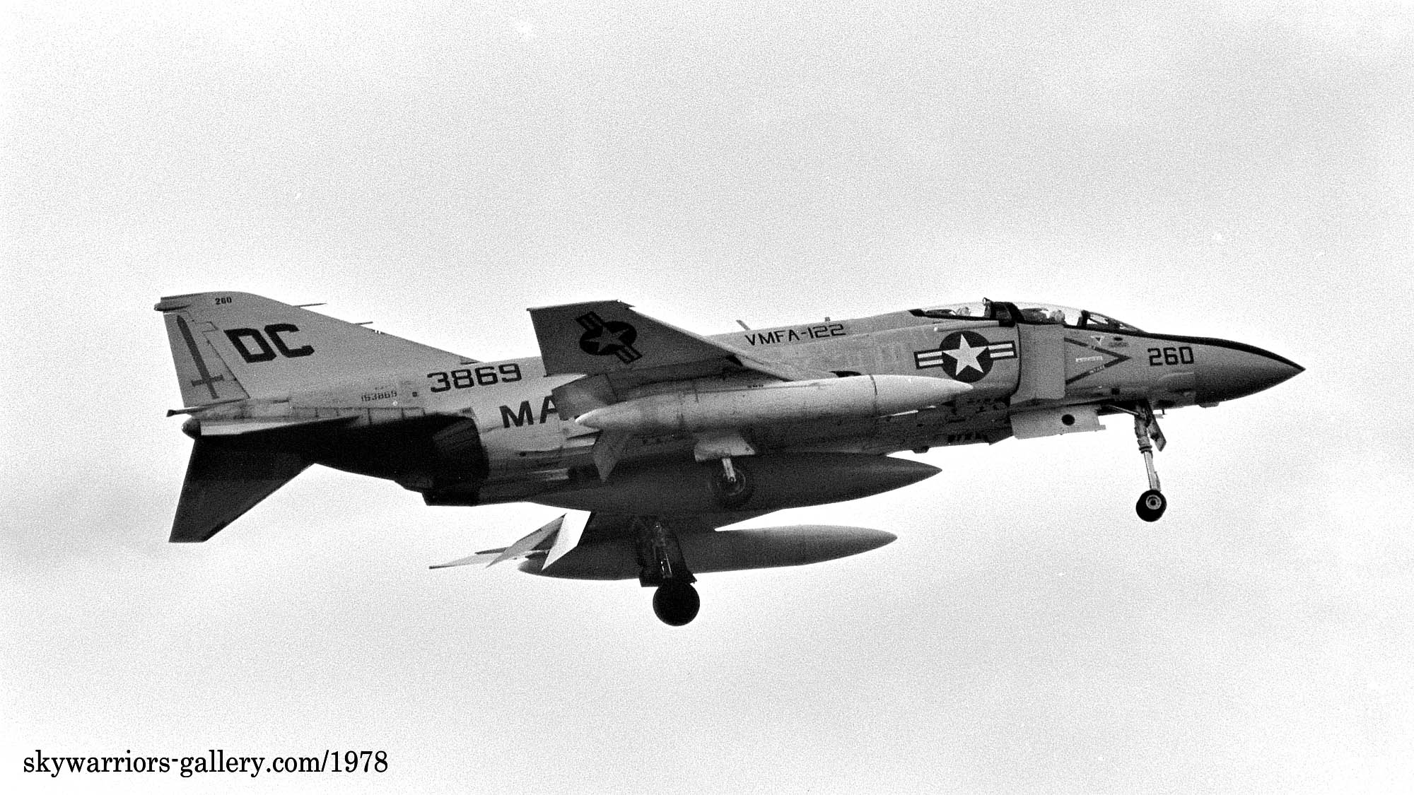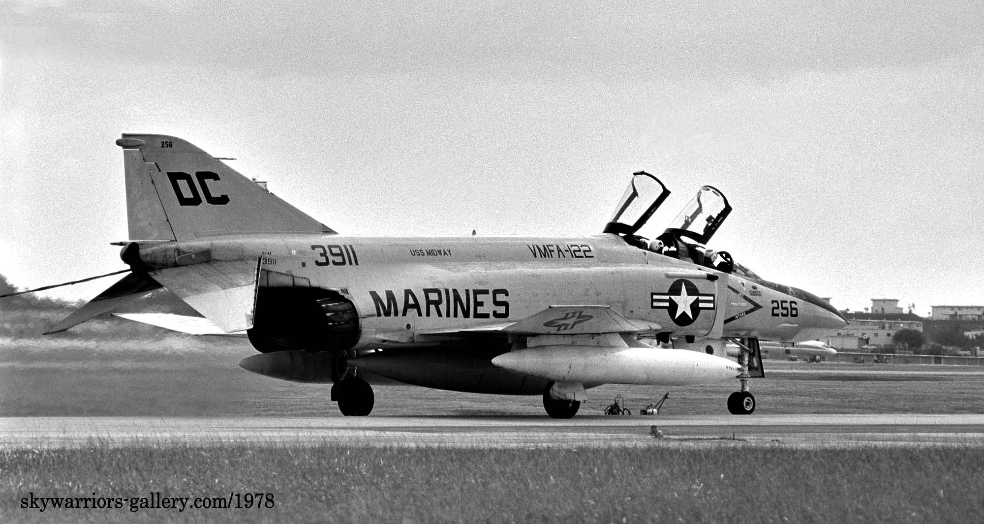 VMFA-122がF-4Jを装備してから初めての岩国基地派遣が1978年7月で、翌年7月までの1年間の駐留期間であった。私が彼らに初めて出会ったのは、1979年7月に岩国のMAG-15に配備された後になるが、1978年9月の嘉手納行と1979年7月の嘉手納行の2回撮影のチャンスがあった。当時VMFA-122のF-4Jはラダーに蒼い剣のマークを入れただけのシンプルな塗装だったが、1年の日本滞在の間に彼らを可能な限り撮りたいと嘉手納基地周辺で駆け回った。彼らはF-4Sに移行した後まもなくFA-18Aに更新した。VMFA-122は1986年にF/A-18Aに機種転換し、VMFA-314についで海兵隊で2番目のホーネット飛行隊となった。ローテーションで岩国にも来るようになり撮影の機会も増えた。