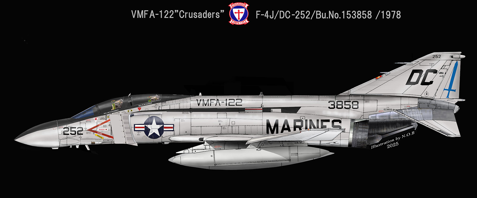 ↑ イラストは同隊が1978年夏頃に空母ミッドウェイに艦載機として展開した時のもので、Modexが3桁番号に変更されていた。DCと言うテールコードを付けたファントム部隊の岩国派遣はこれが最後であった。F-4J/DC-252/Bu.No.153858