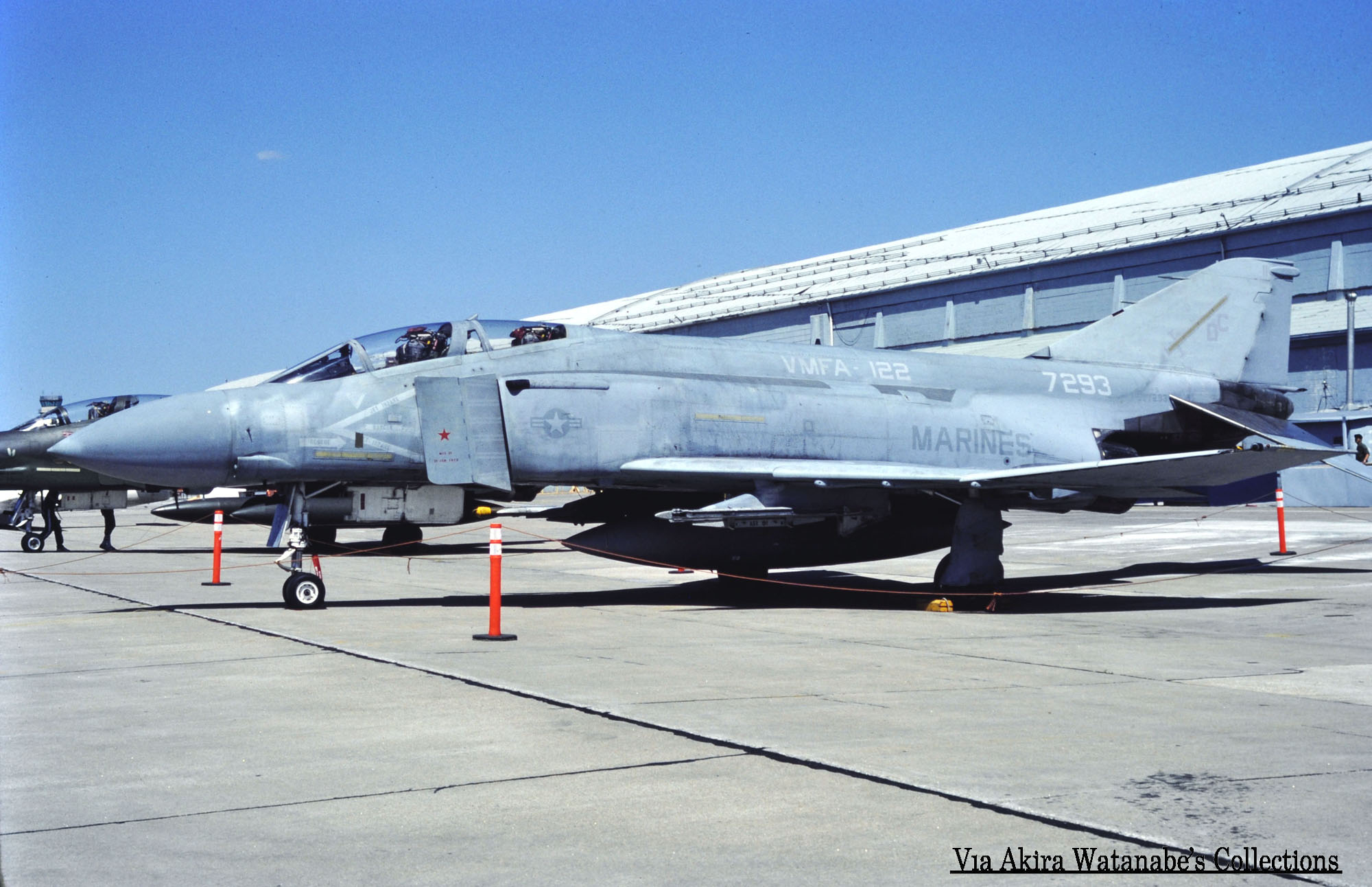 ↑ 1984年6月にオファット空軍基地で展示されたVMFA-122のF-4S。同隊がF-4S型に更新された後の写真は比較的少ないが、海兵隊の飛行隊の中では2番目に早くF/A-18Aに更新されため、S型の使用期間が短かったためかもしれない。写真のF-4S/Bu.No.157293は、Mig撃墜マークを付けているが、1972年9月11日同機がVF-31時代にMig-21をAIM-9サイドワインダーミサイルで撃墜している事を示している。