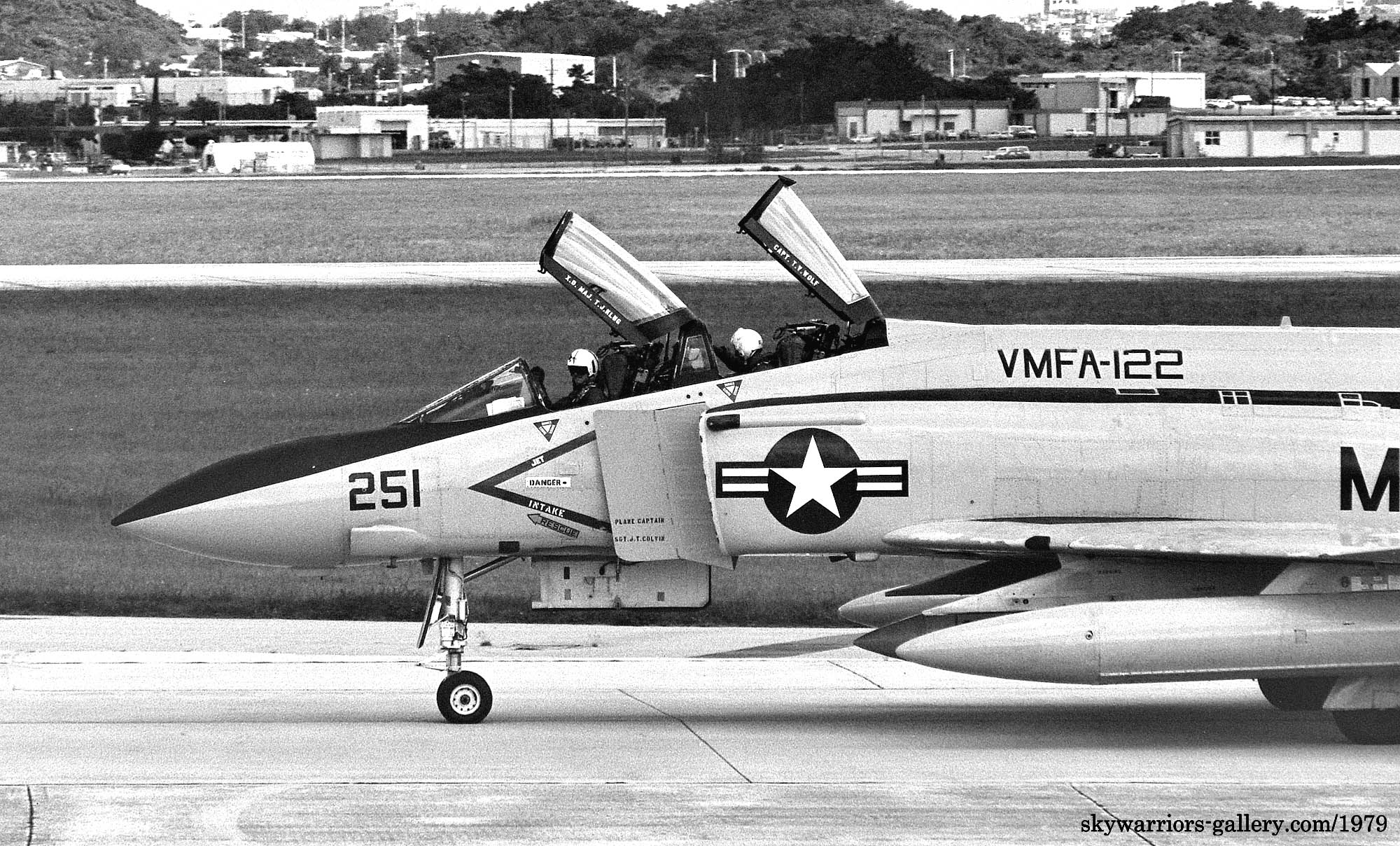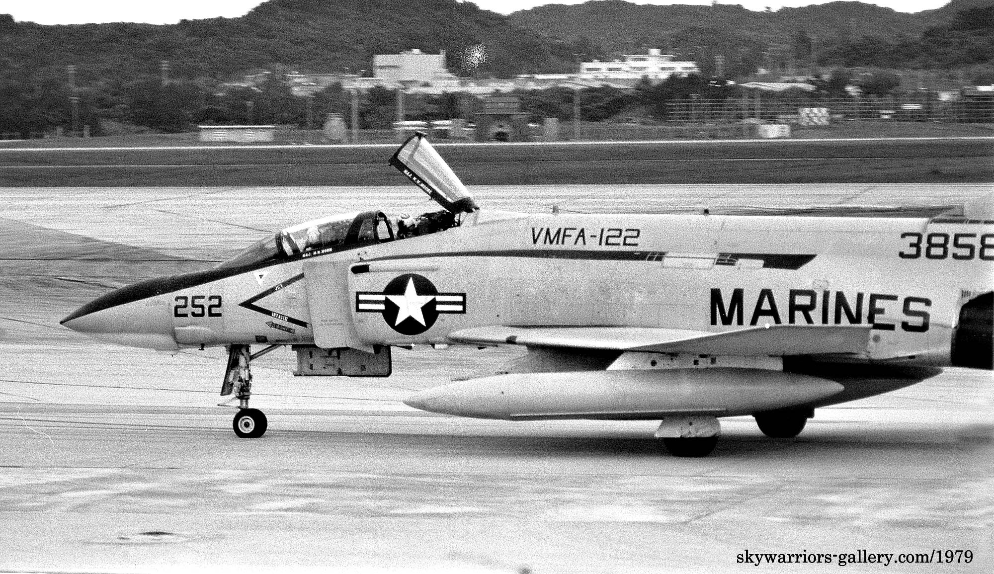 ↑1979年6月嘉手納基地のR/W23に向かってタクシングするVMFA-122のF-4J。センタータンクに剣持った十字軍戦士らしきシルエットが書かれている。ベトナム戦では彼らは、20mmガンポッドを多用した戦いをしている。