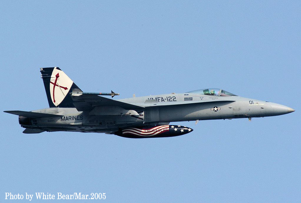 ↑ 2005年5月にWhite Bearさんが岩国基地で撮影されたVMFA-122の十字軍風マーキング。数多きFA-18のショーバードの中で最も人気の高かった塗装の一つで、曲線を上手く使った非常に良いデザインである。胴体下の燃料タンクには星条旗が書かれ、"Crusaders"と黒色で書かれている。