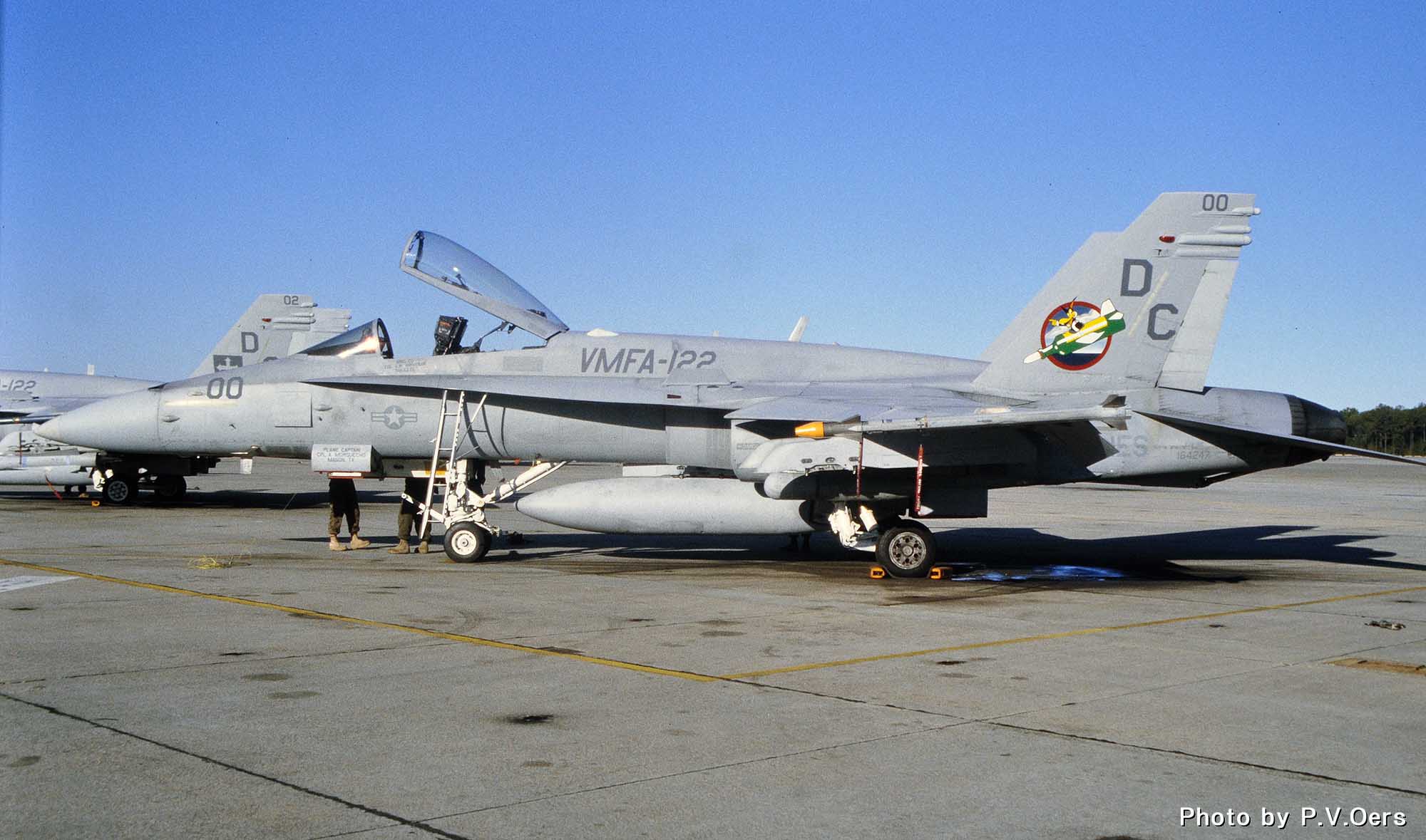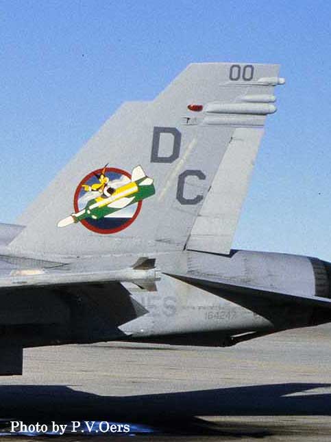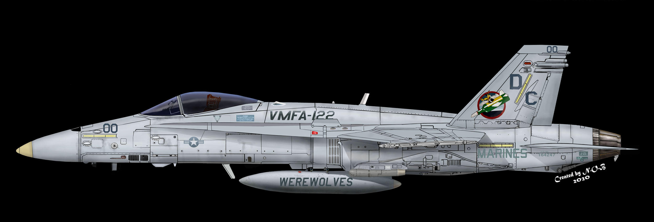 ↑ 2008年のデザイン変更に伴いDC-00は、部隊の元来のインシグニアを尾翼に描いた。酒瓶に乗った酔っぱらいの狼君である。尾翼内側はノーマーキングである。 VMFA-122 F/A-18C Bu.No.164247