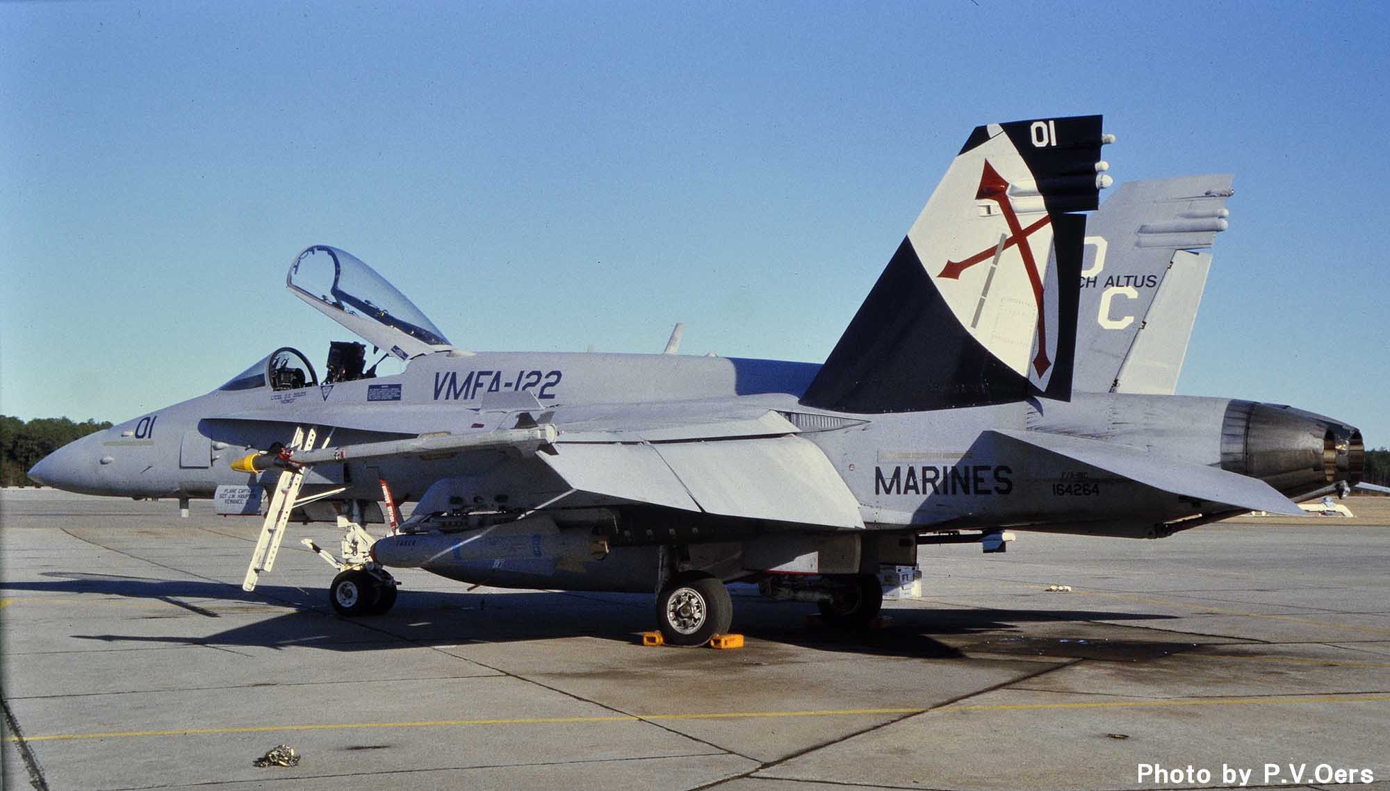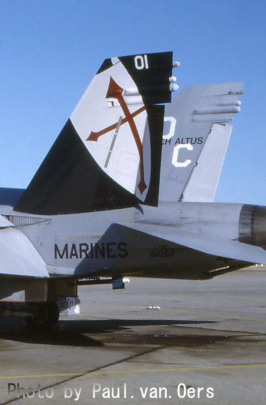 ↑ 2002年横田公開で展示されたDC-01に引き続き、2004年はより派手になって、ついに十字軍盾が尾翼全体に描かれるようになり このVMFA-122の司令官指定機の塗装は、この後の部隊マーキングに大きな影響を与えた。VMFA-122 F/A-18C Bu.No.164264