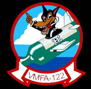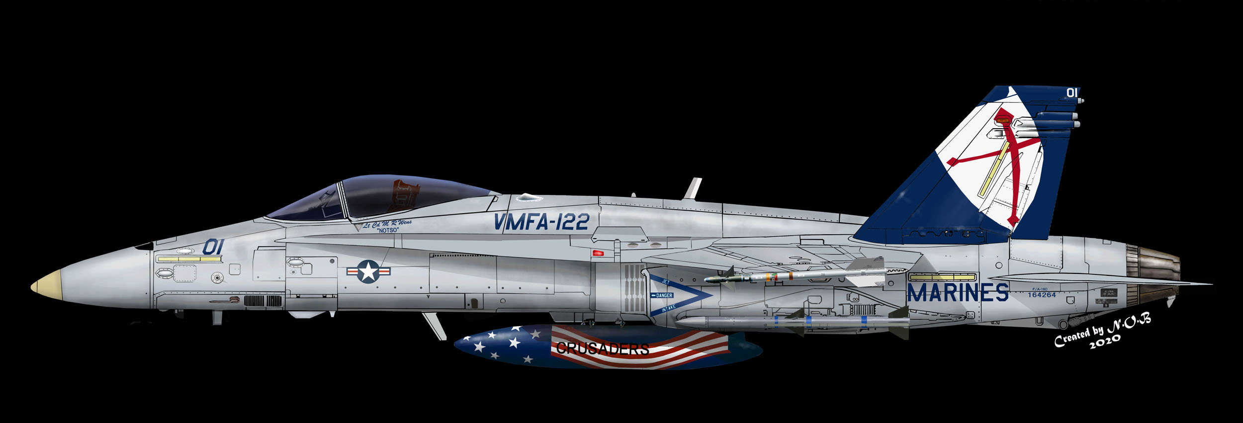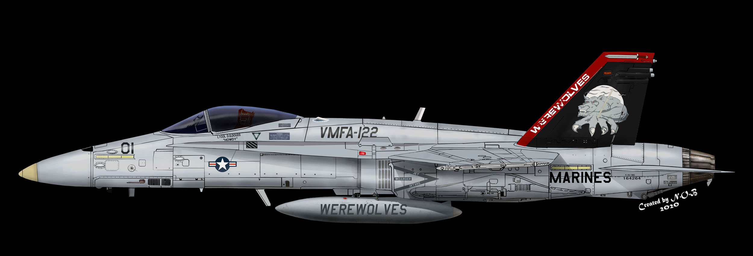 ↑ 2008年に元々の部隊名に由来する「狼たち」のコンセプトに基づきデザインを変更。狼は狼男に変身して尾翼に爪痕を残したマーキングが入った。DC01以外はこのデザインをロービジ調で統一したが、塗装変更の過渡期には、いくつかの異なる狼男が尾翼を飾っていた。VMFA-122 F/A-18C Bu.No.164264