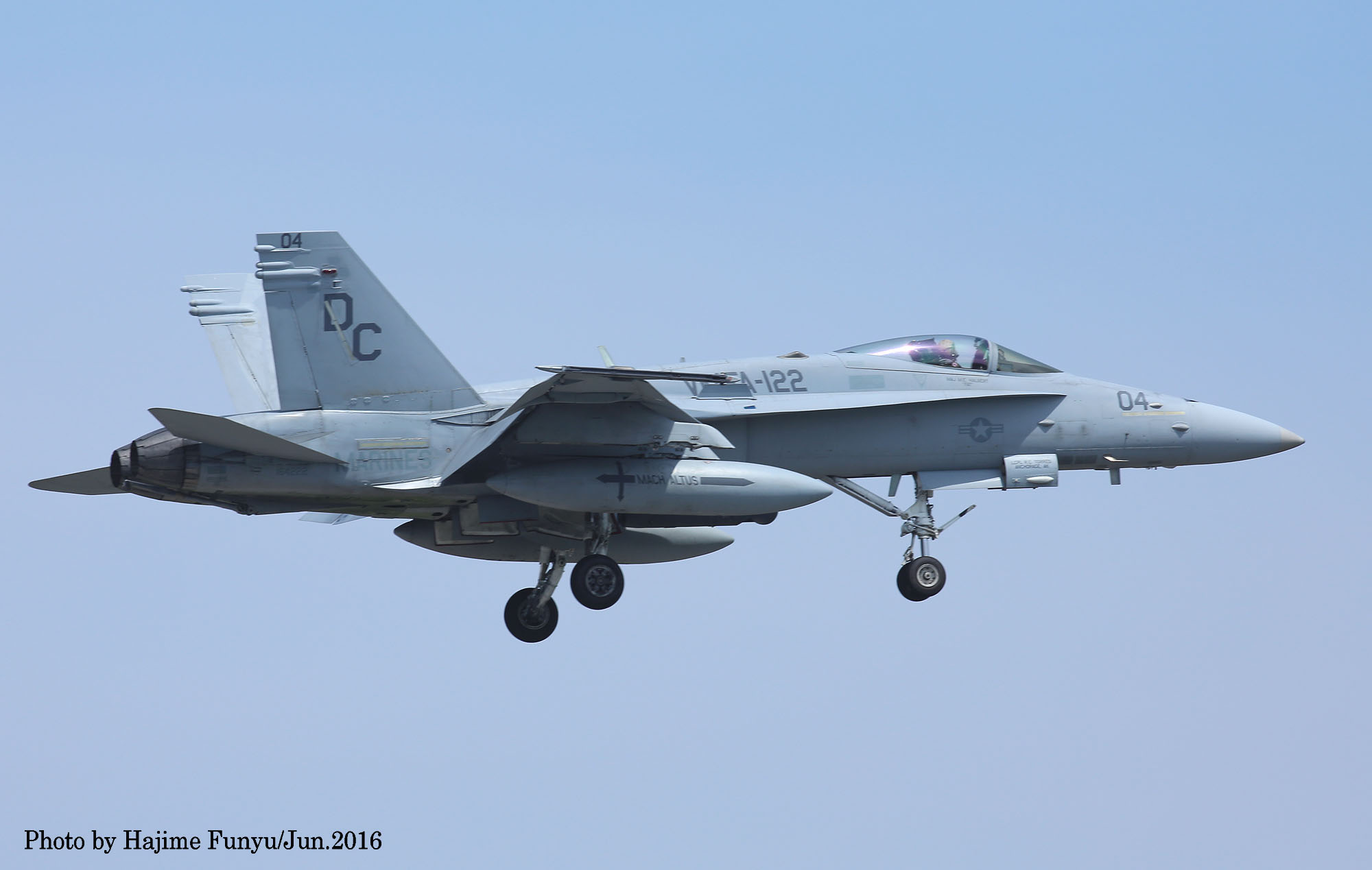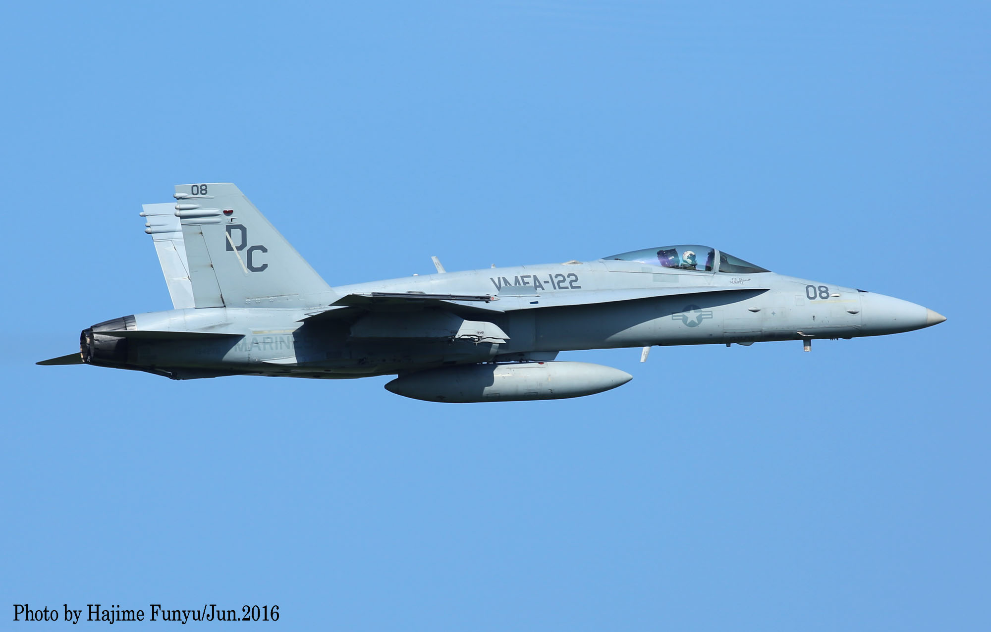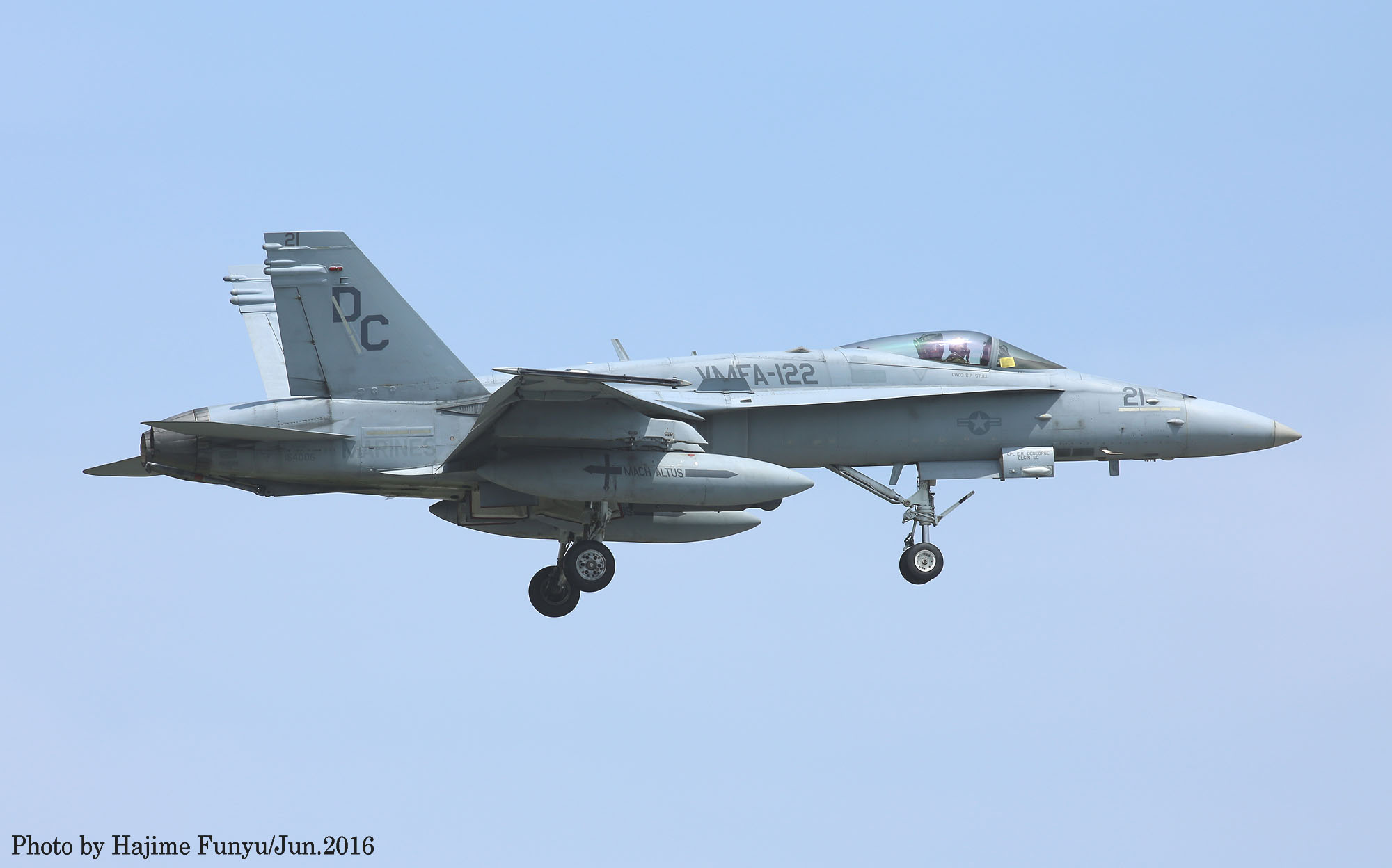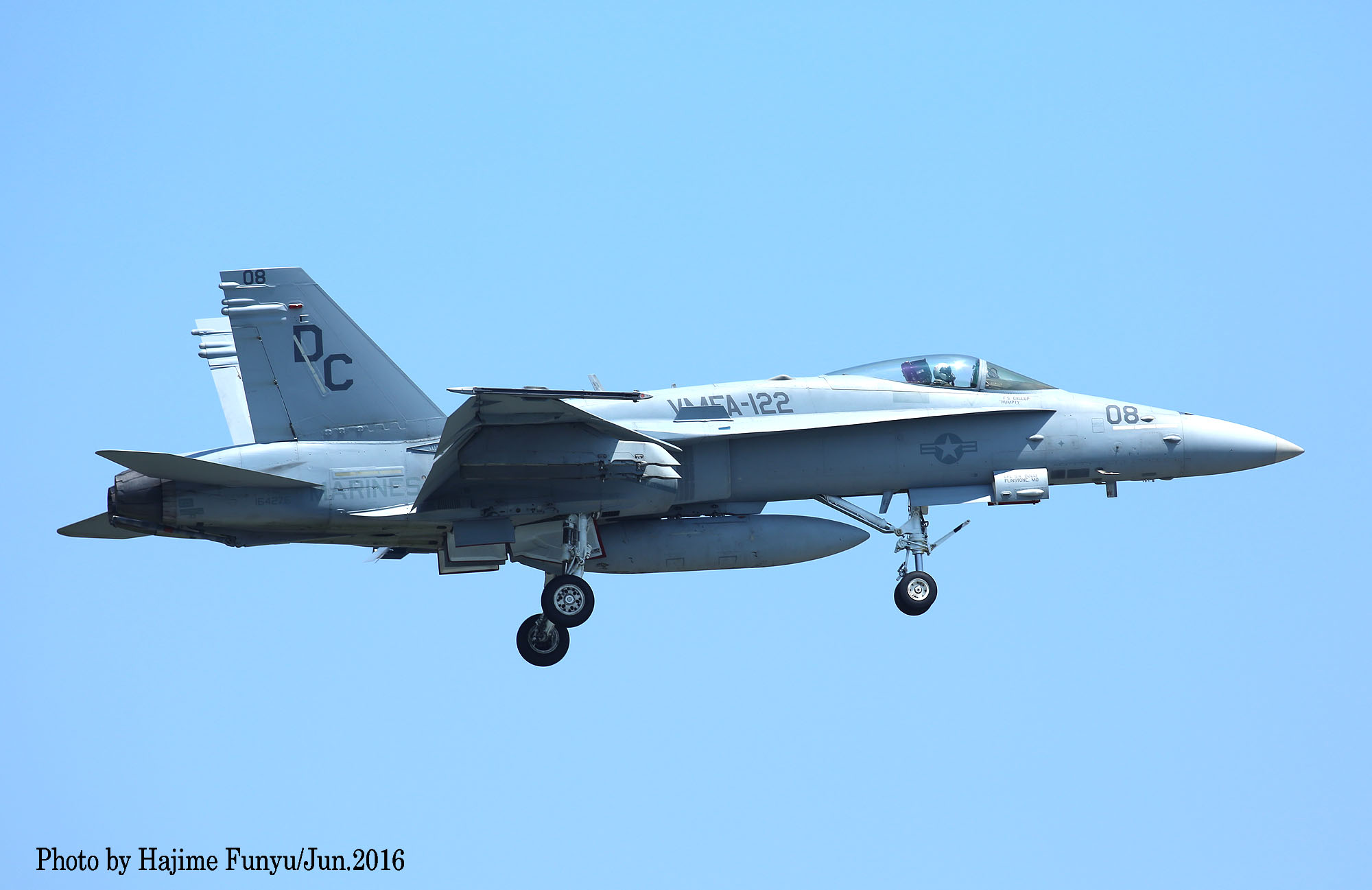 ↑ 2016年6月某日に厚木に降りたVMFA-122のFA-18Cで、この日はDC-00/01/08/21等4機が飛来した。一連の写真はフニュ師匠撮影のものである。同隊は2016年3月14日 デレク・M・ブラウン中佐(VMFA-122司令)の元、10機のFA-18Cと200人の要員と共にアメリカのビューフォート基地から岩国基地に移動、半年の派遣任務に就いた。