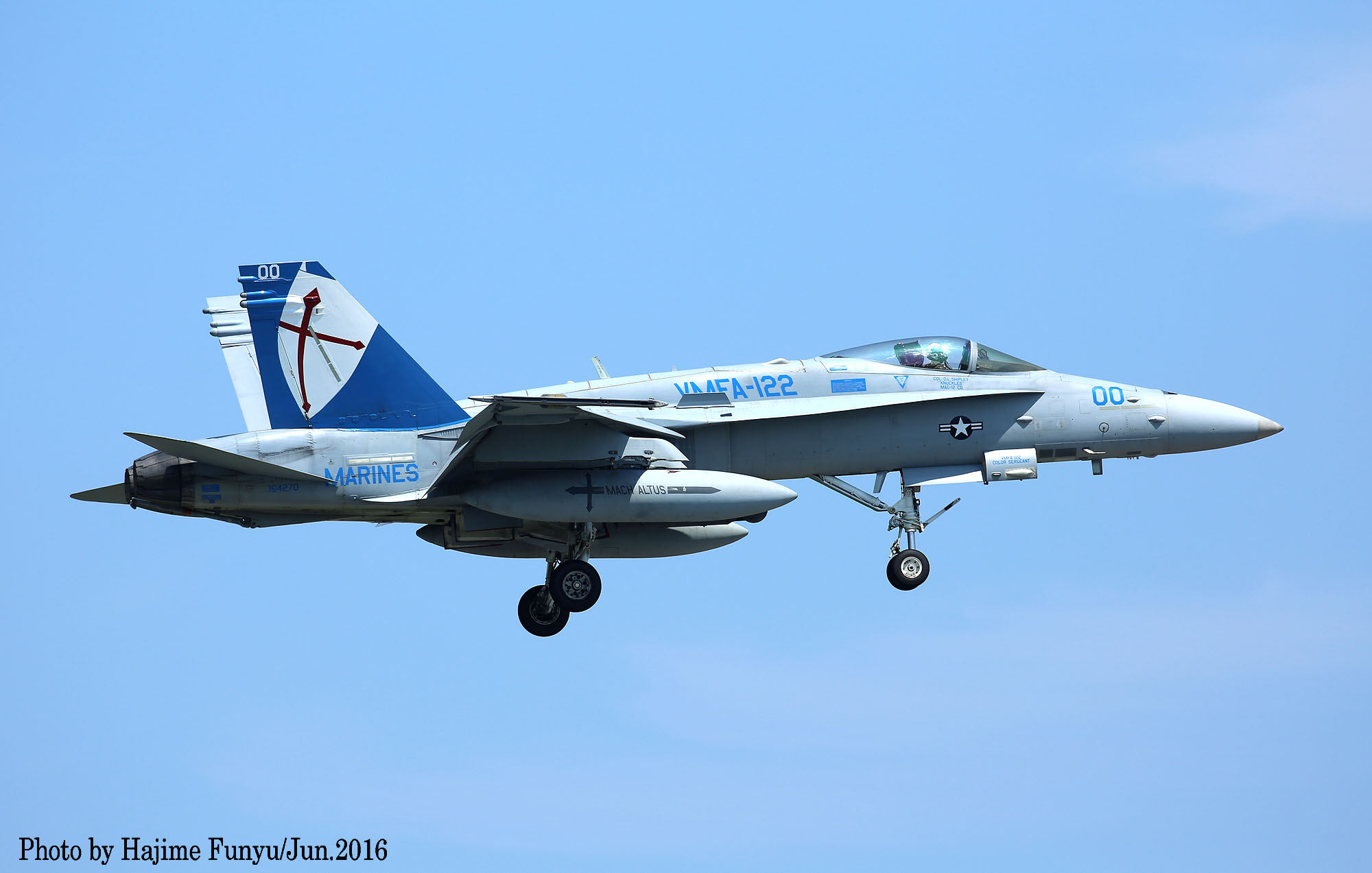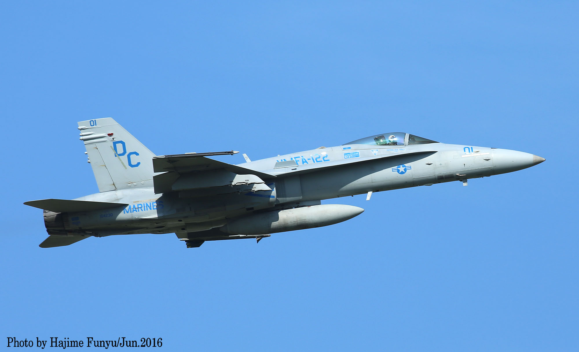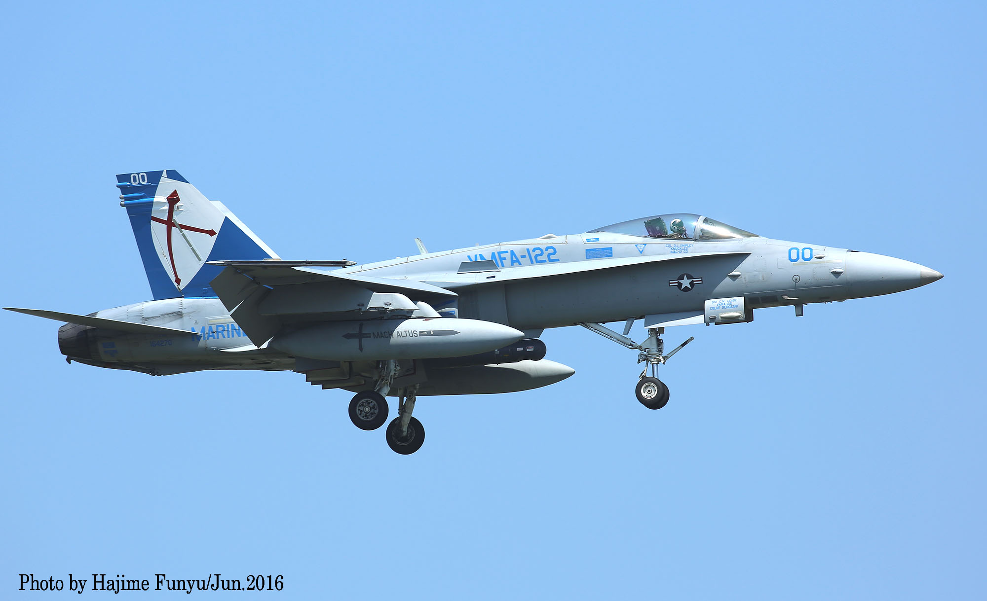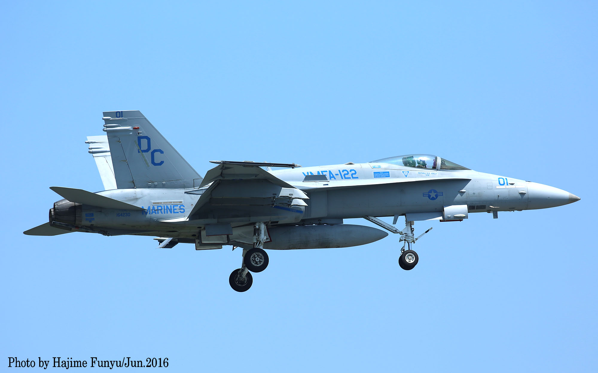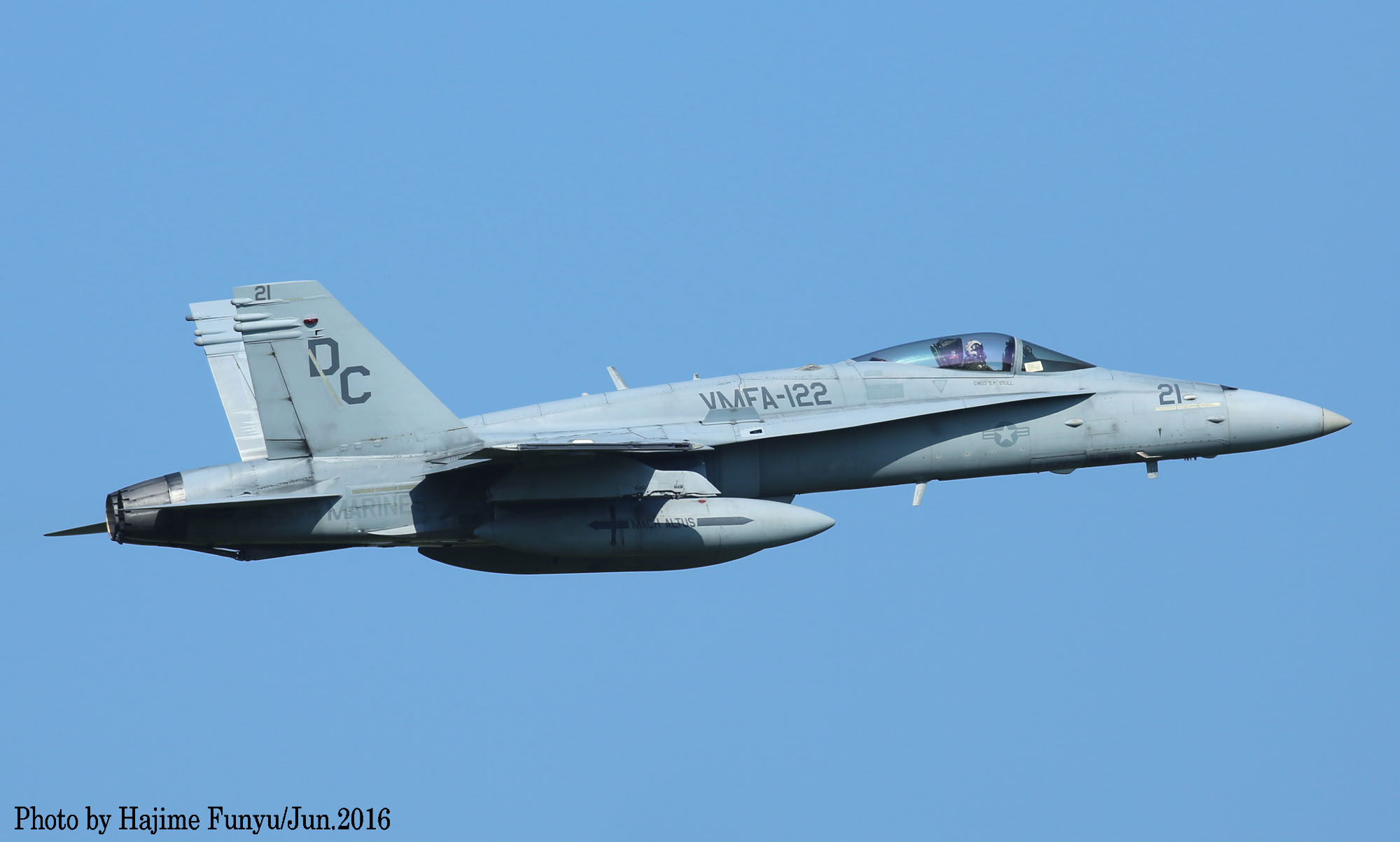 ↑ 2016年6月某日に厚木に降りたVMFA-122のFA-18Cで、この日はDC-00/01/08/21等4機が飛来した。一連の写真はフニュ師匠撮影のものである。同隊は2016年3月14日 デレク・M・ブラウン中佐(VMFA-122司令)の元、10機のFA-18Cと200人の要員と共にアメリカのビューフォート基地から岩国基地に移動、半年の派遣任務に就いた。