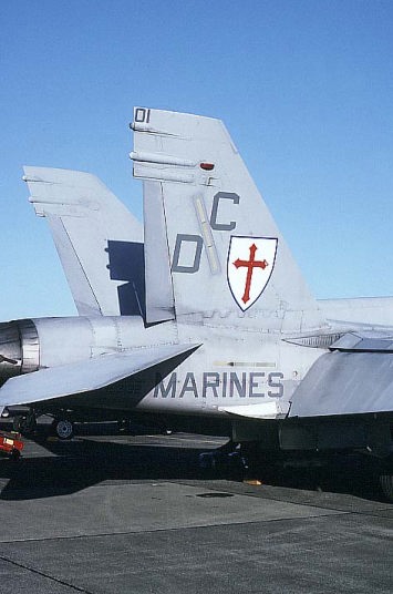 ↑2000年横田基地に展示されたVMFA-122/DC-01。一時的にVMFA-122のテールレター”DC”が無い?時期があった。しかし 01以外の他の機体も十字軍の盾は黒で書き込まれており、ロービジ全盛期にあって比較的目立つマーキングだったのだ。