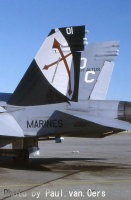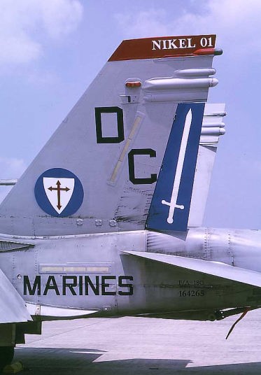 ↑ 2008年のデザイン変更に伴いDC-00は、部隊の元来のインシグニアを尾翼に描いた。酒瓶に乗った酔っぱらいの狼君である。尾翼内側はノーマーキングである。 VMFA-122 F/A-18C Bu.No.164247
