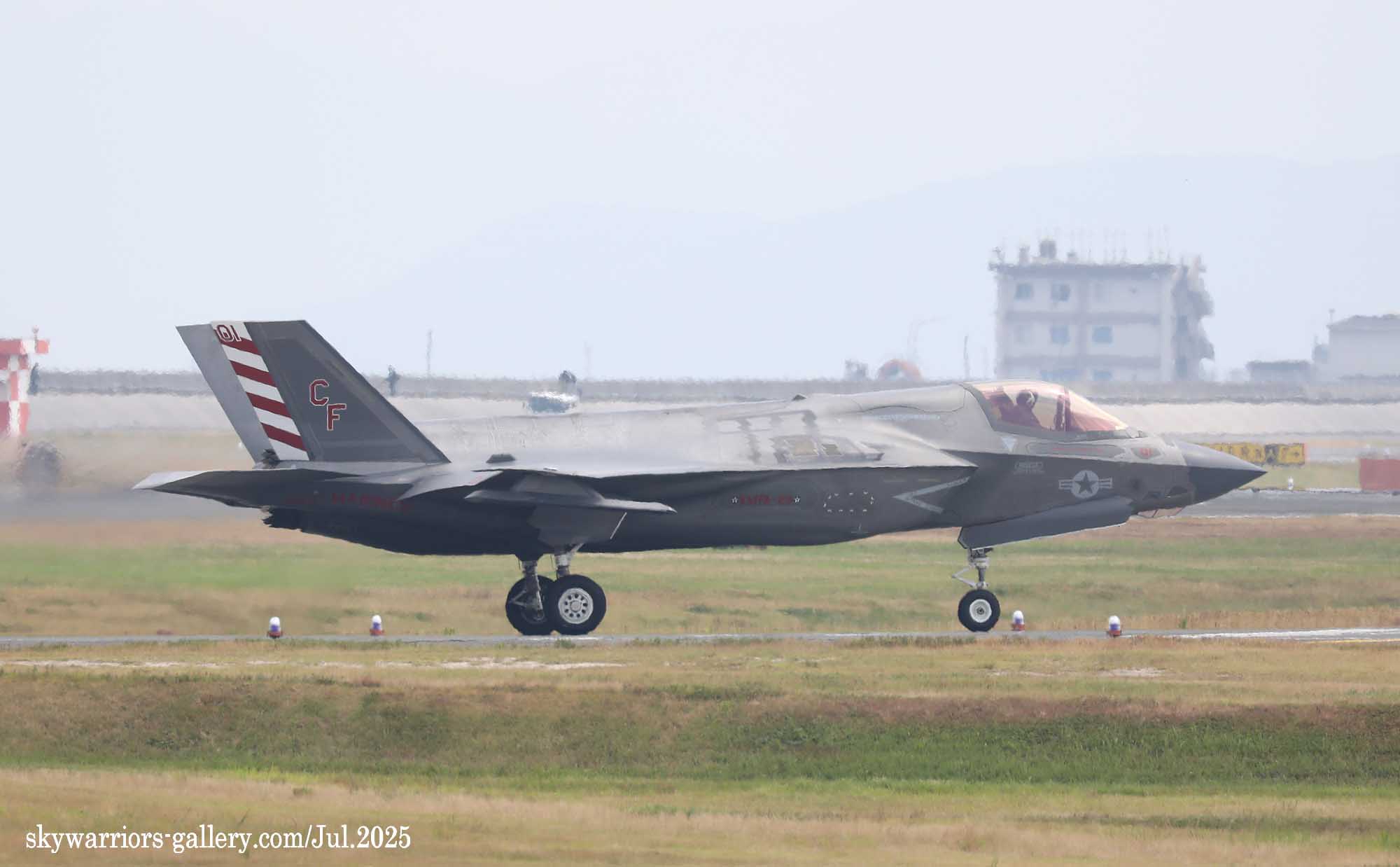 ↑ 岩国基地R/W20に着陸するF-35BのCF-01機。ラダーの赤白ラインはインシグニアのリボンの端の色から取り入れており、A-4スカイホーク時代からこのカラーリングは有名。胴体側面の部隊番号の左右にはアメリカ軍の旧航空機識別識別マークが入っている。
