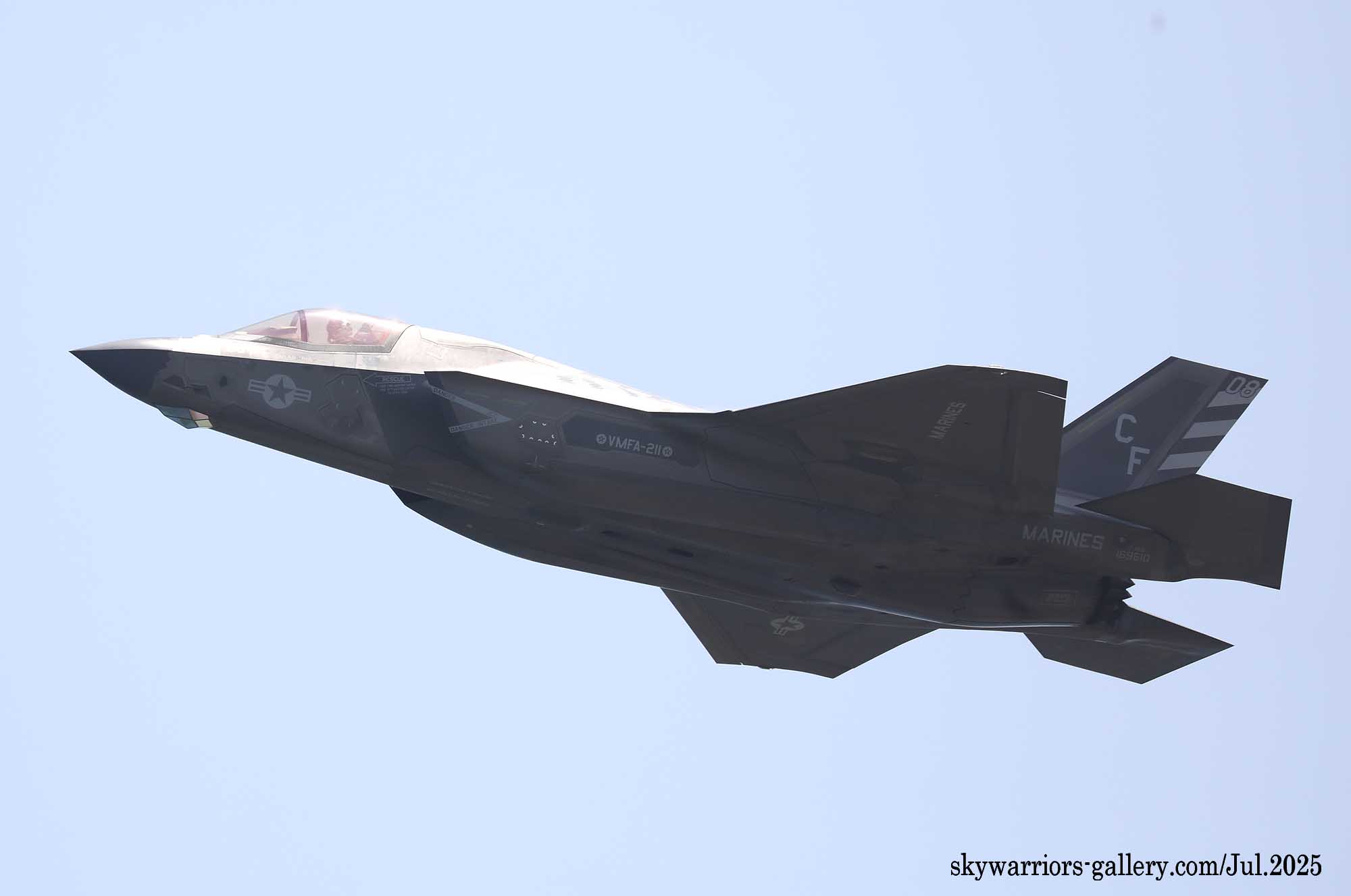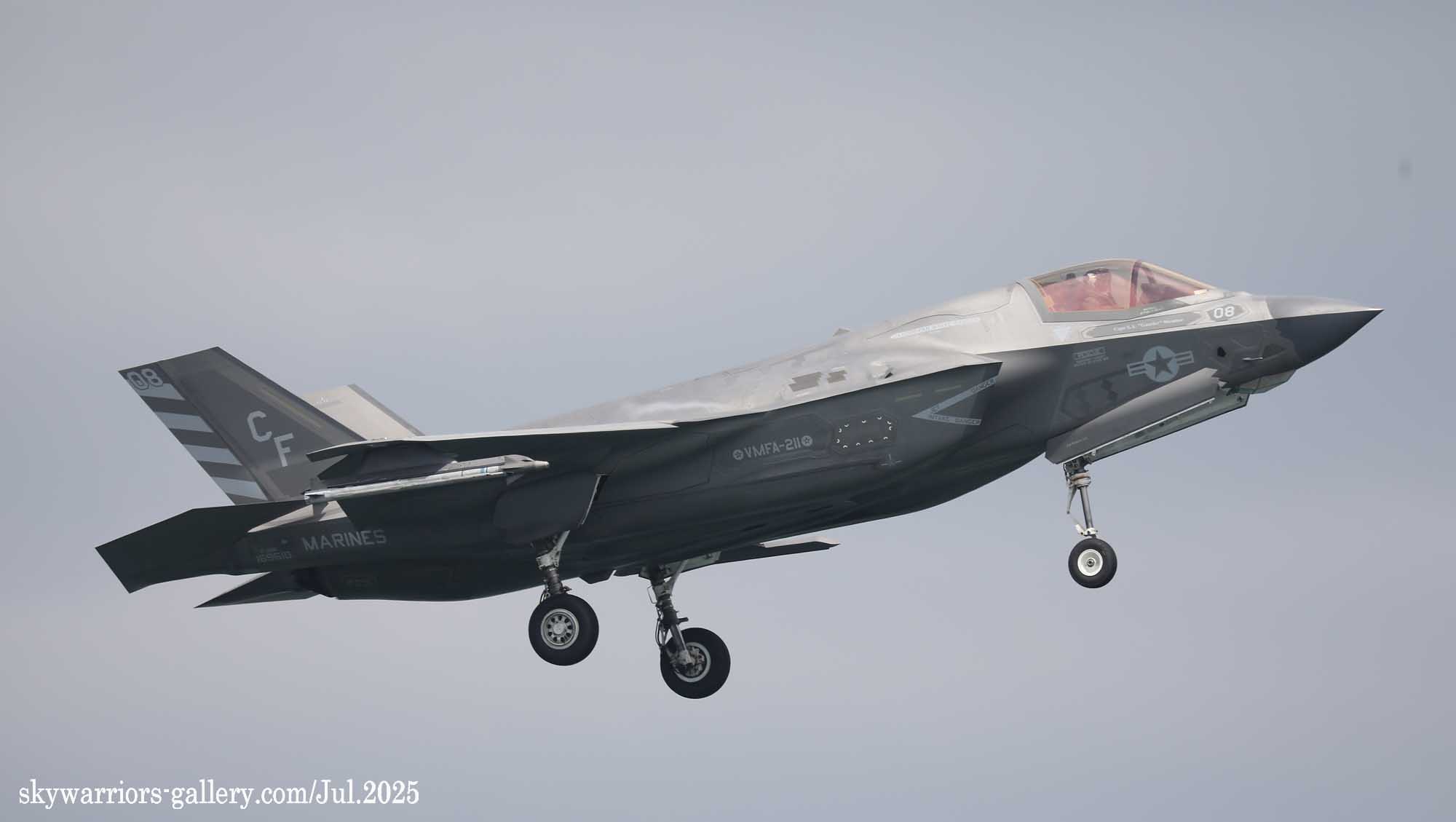 2025年5月10日 海兵隊岩国航空基地に新たなF-35Bの部隊が加わった。A-4スカイホーク時代から日本にゆかりもあるVMFA-211 ウェークアイランド アベンジャーズだ。アベンジャーとは”復讐者”・・・誰に対する復讐かと言えば、スカイホークの項でも既述したように、日本軍に島を奪われ、機材を失った同飛行隊の日本に対する復讐なのである。今はそのような昔話を知っている人も少ないだろうが、これも歴史であり知識として持っておくのも悪くない。最近海兵隊のF-35Bも隊長指定機/ショーバードに派手な色を使うようになったが、VMFA-211の隊長機は今までの岩国飛来の部隊の中で最も艶やかな塗装を施しており、注目された。