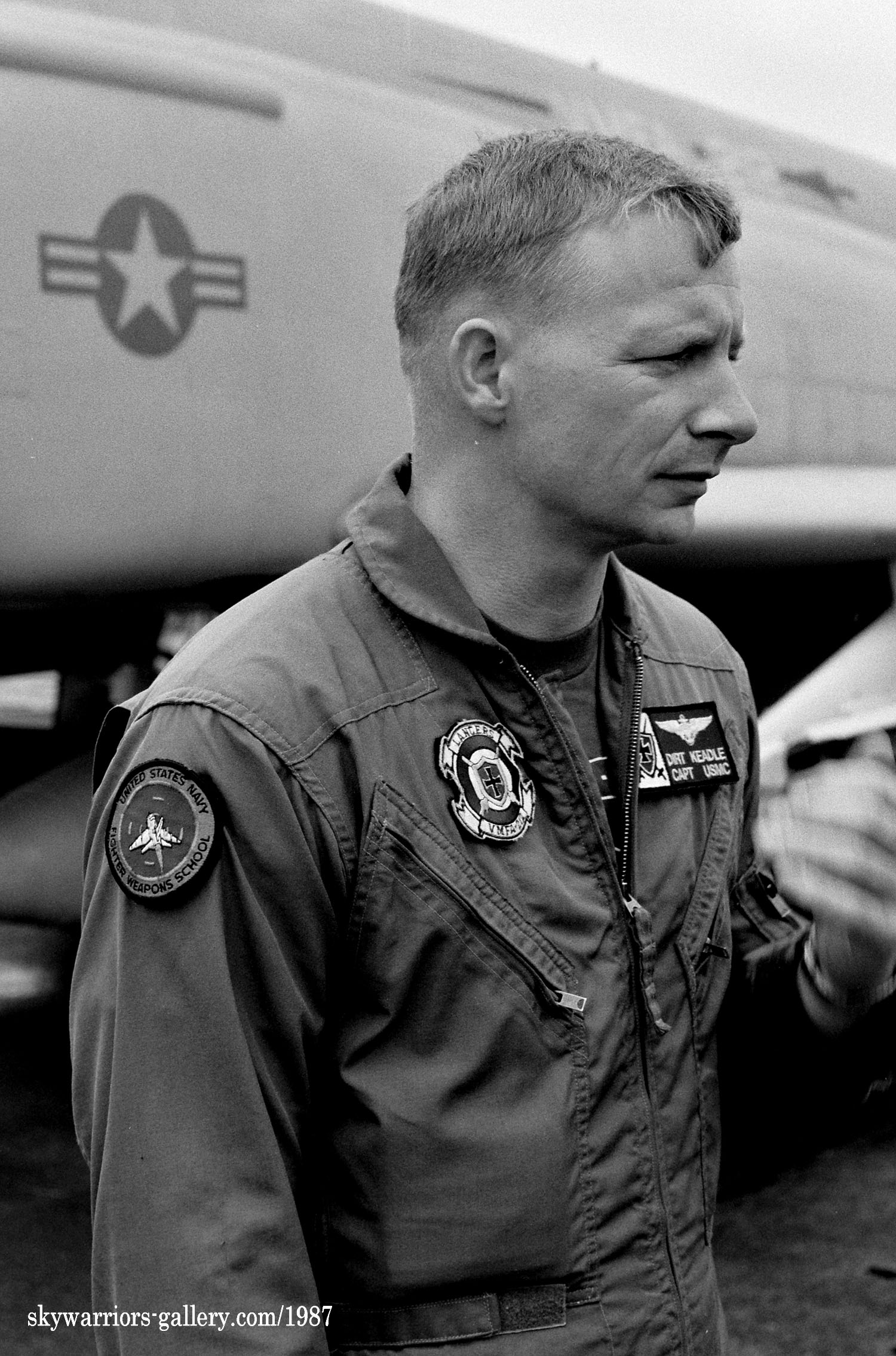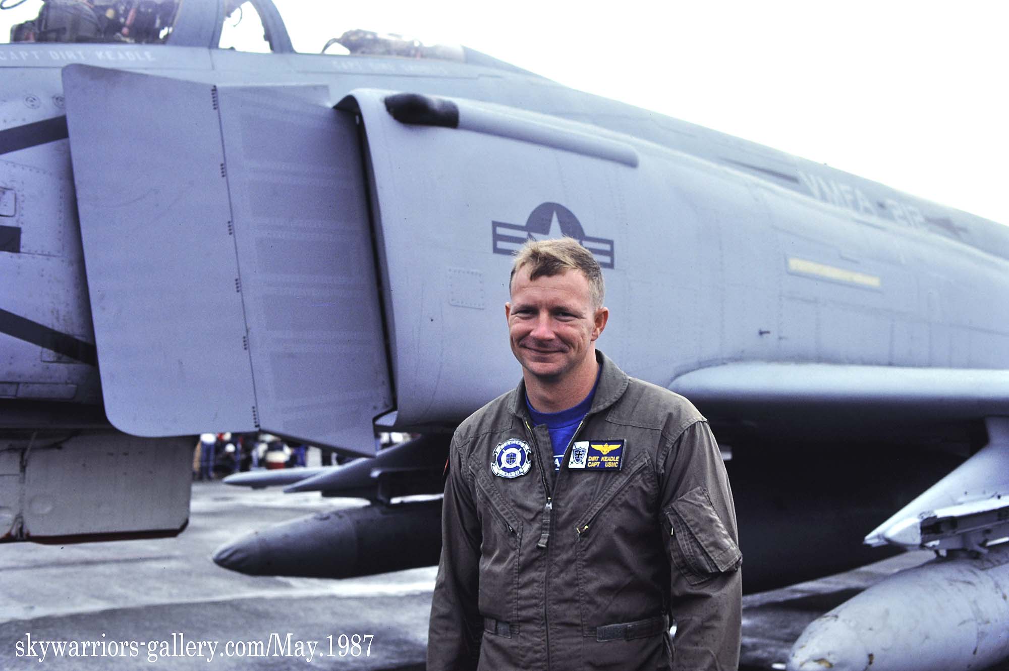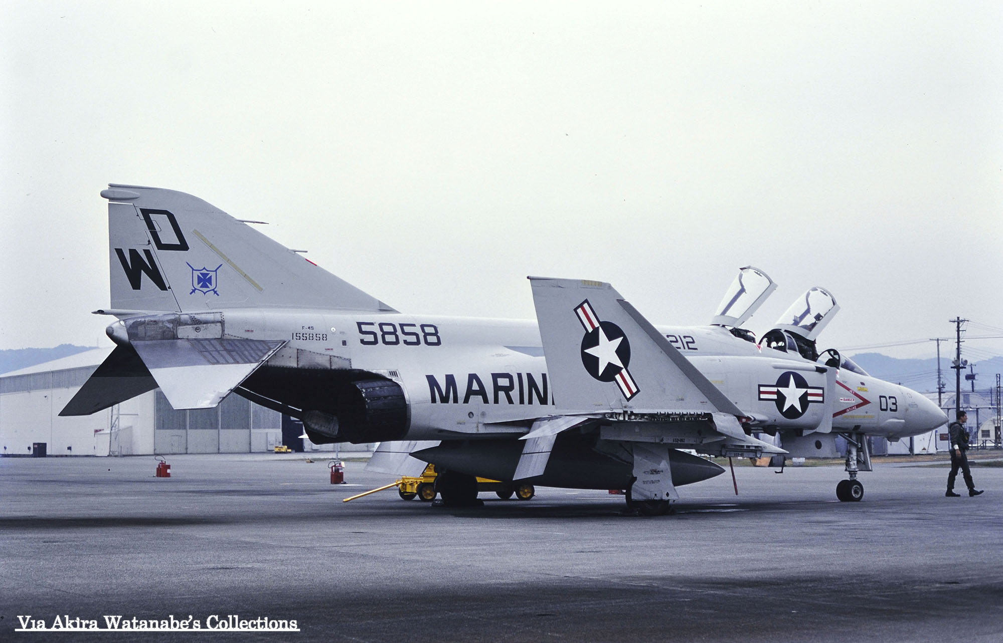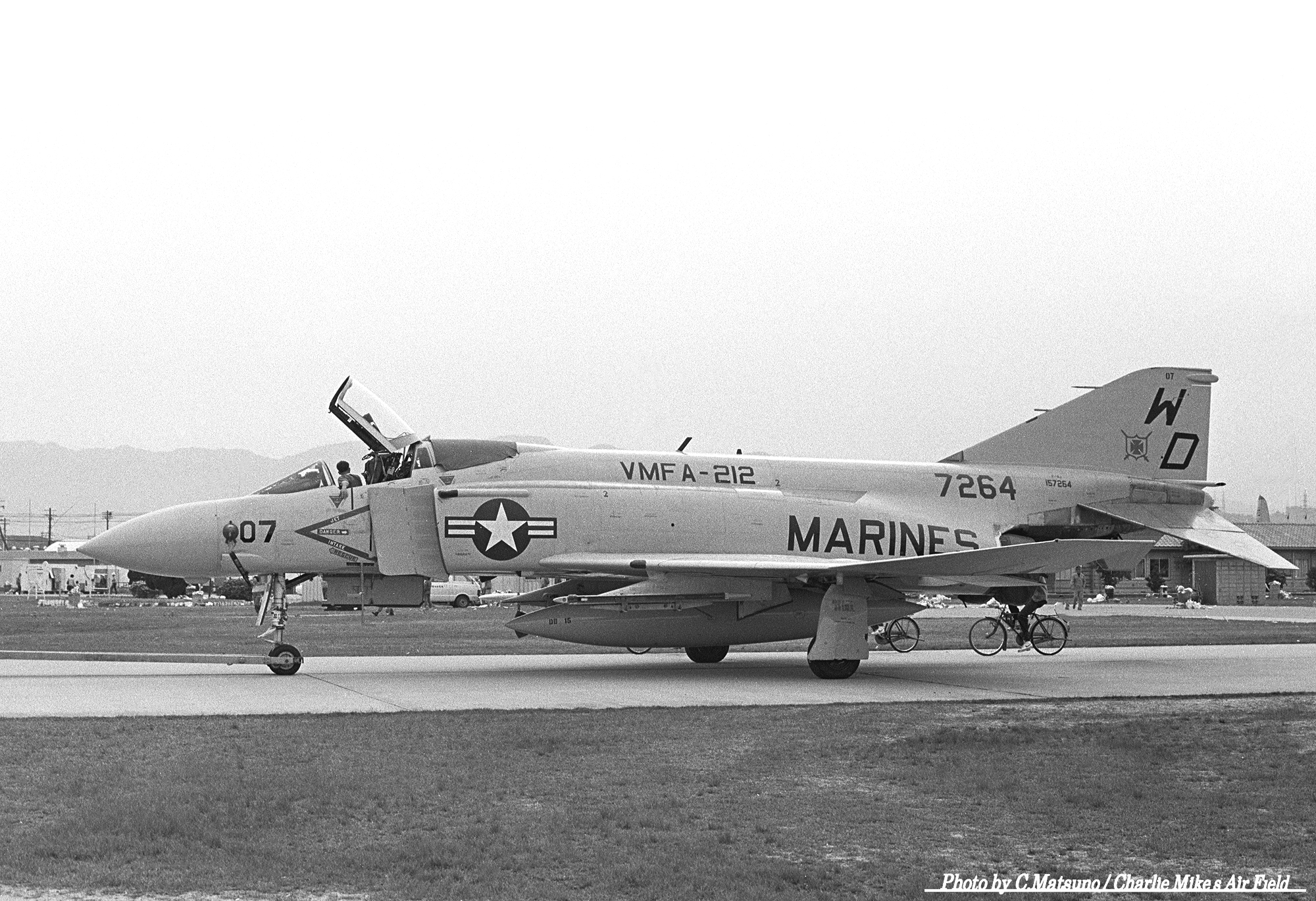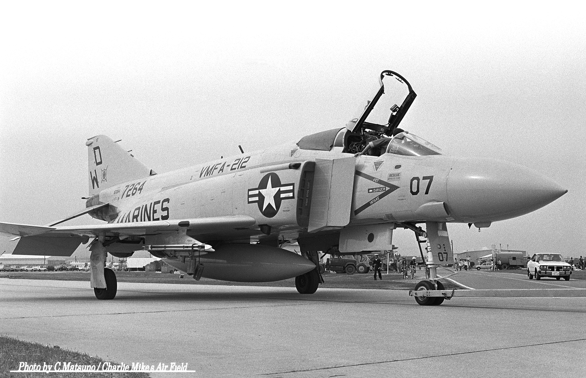↑ 1981年5月岩国基地の航空祭に展示されたVMFA-212のF-4J/WD-07。この機体は数年後にS型に改良されて海軍のVF-151(厚木基地)に配属されている。後ろには真っ白な尾翼のVMA(AW)-121のA-6Eが見える。White