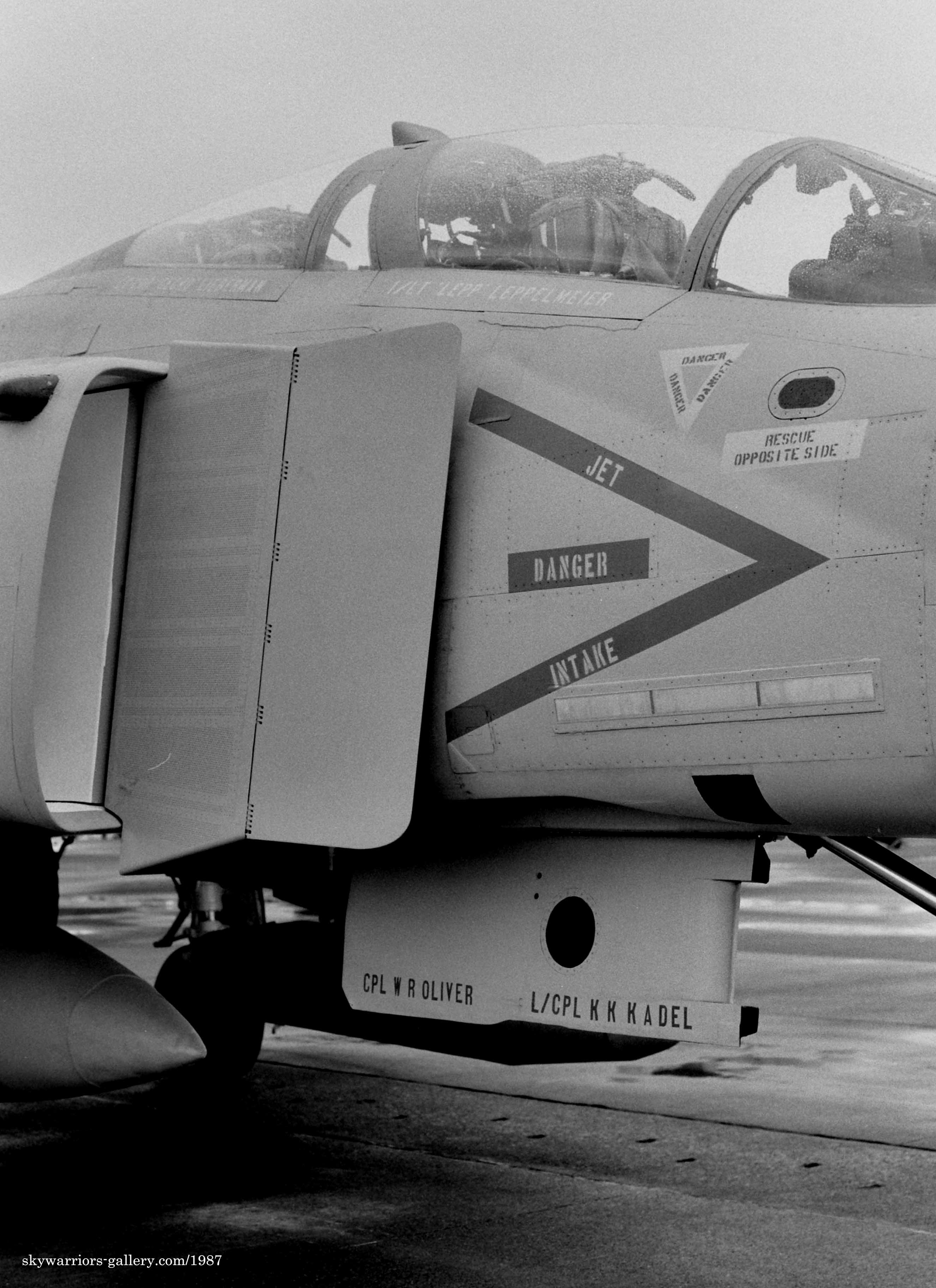 1987年5月 厚木基地の公開日に展示されたVMFA-212のF-4S。VMFA-235に替って1987年4月から配備されたが、この年の10月まで岩国基地に居て最後の岩国駐留のF-4S飛行隊となった。因みに、岩国基地に最初にF-4Sを持ってきたのはVMFA-212であり、1979年9月の事になる。S型は、HUDを装備した最新の爆撃照準装置を追加しており、エンジンは、無煙化されていた。