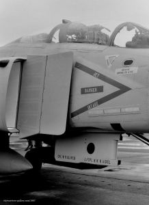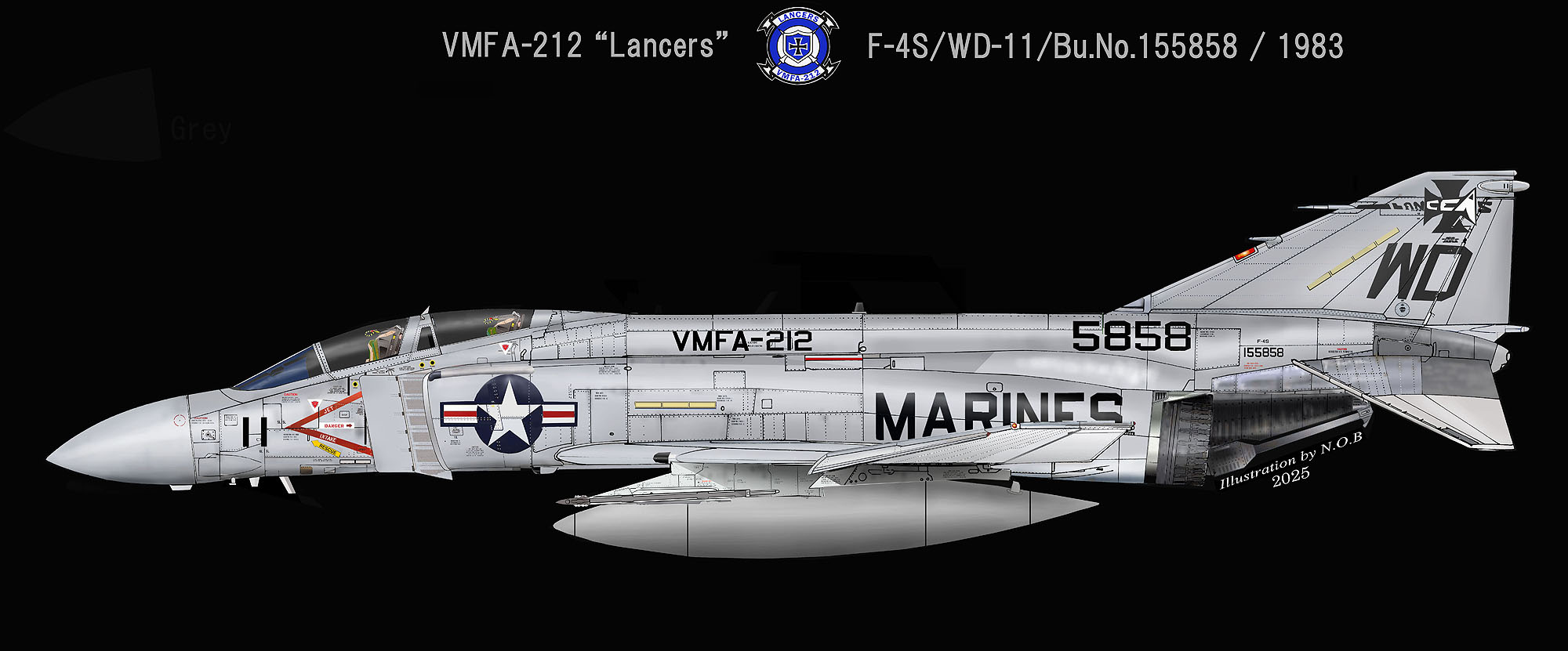 ↑ 1983年に岩国基地に派遣されたVMFA-212の機体は既にS型に変更されていたが、塗装は未だつやのあるミディアムグレー色で、尾翼のピトー管の一部を利用した形で長槍(ランサー)がバルカンクロスと共に描かれた。このデザインの中に"LANCERS"と文字が刻まれている凝ったもの。F-4S/WD-11/Bu.No.155858