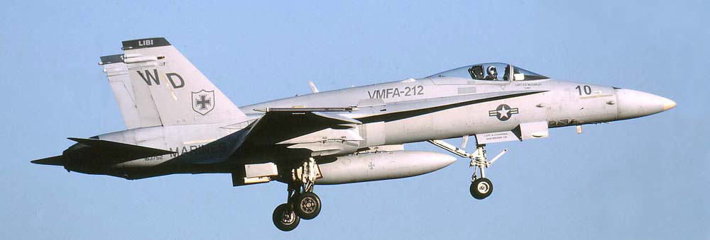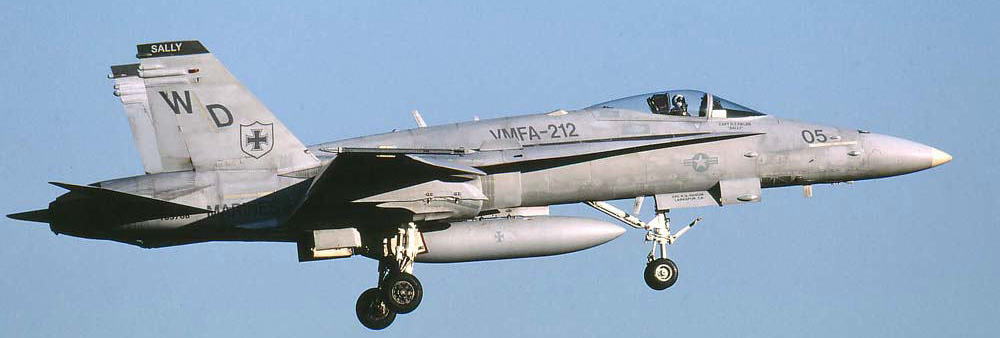 ↑ VMFA-212のコマンダー機”ランサー01”は過去何度もマーキングを換え、その都度マニアから熱い視線を送られてきた。上の写真は2005年3月から使用されたマーキング。VMFA-212にFA-18が配備された初期のデザインをベースとして、シンプルなデザインとなったが、バルケンクロイツの枠にしまりがなくマニアからはあまり高い評価を受けなかった。